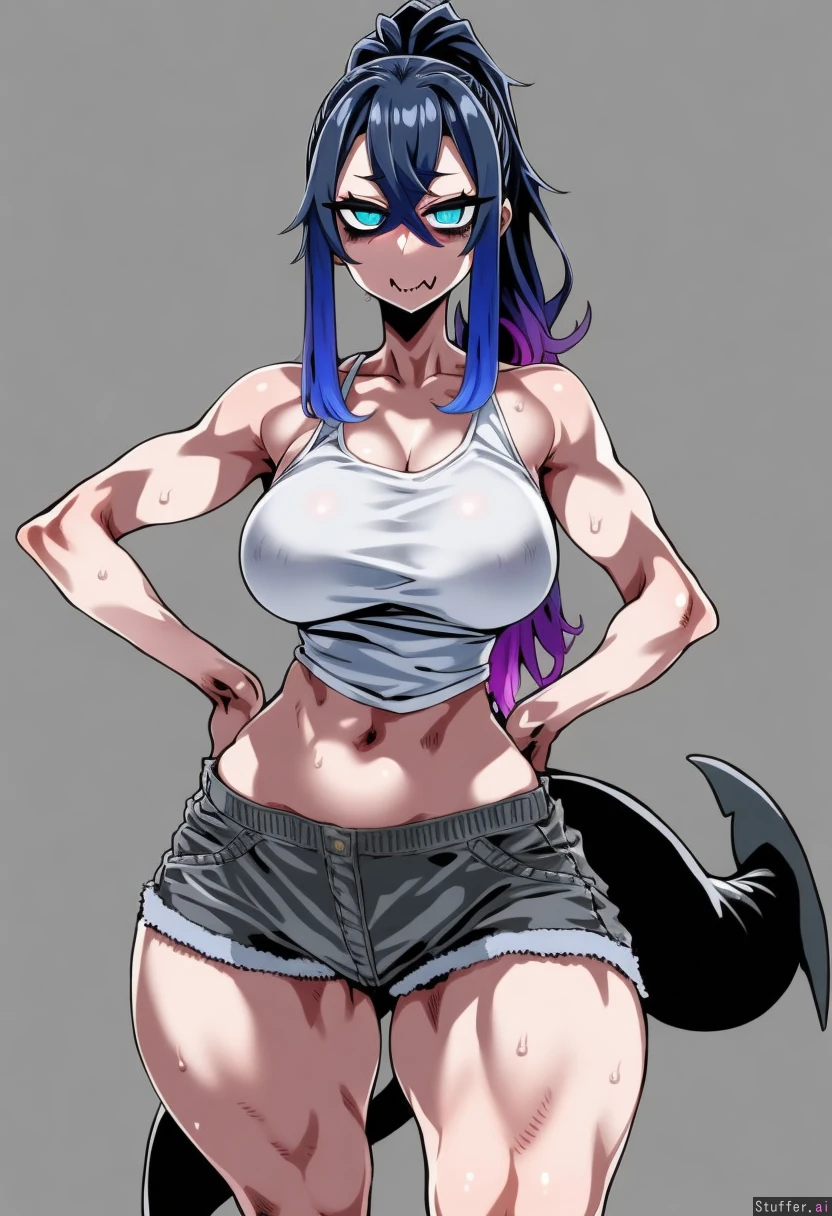best quality, high rating, (by asanagi:0.9), cowboy view, simple background, 1woman, (larger female), mature, bags under eyes, blue eyes, blue hair, black hair, gradient hair, multicolored hair, long hair, ponytail, fluffy hair, crossed bangs, black tail, shark tail, muscular, muscular legs, thick thighs, skin fang, wide hips, medium breasts, white shirt, tank top, gray shorts, denim shorts, looking at viewer