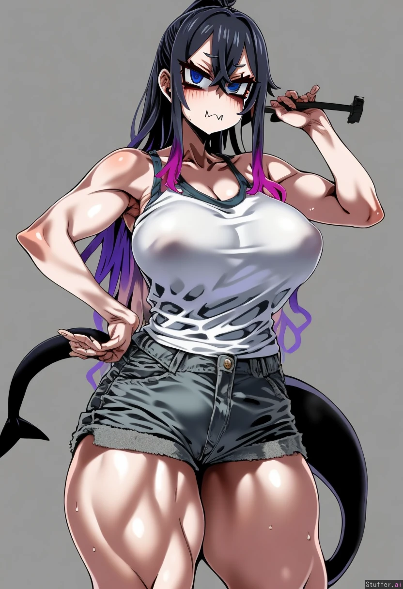 best quality, high rating, (by asanagi:1.4), cowboy view, simple background, 1woman, (larger female), mature, bags under eyes, blue eyes, blue hair, black hair, gradient hair, multicolored hair, long hair, ponytail, fluffy hair, crossed bangs, black tail, shark tail, muscular, muscular legs, thick thighs, skin fang, wide hips, medium breasts, white shirt, tank top, gray shorts, denim shorts, looking at viewer
