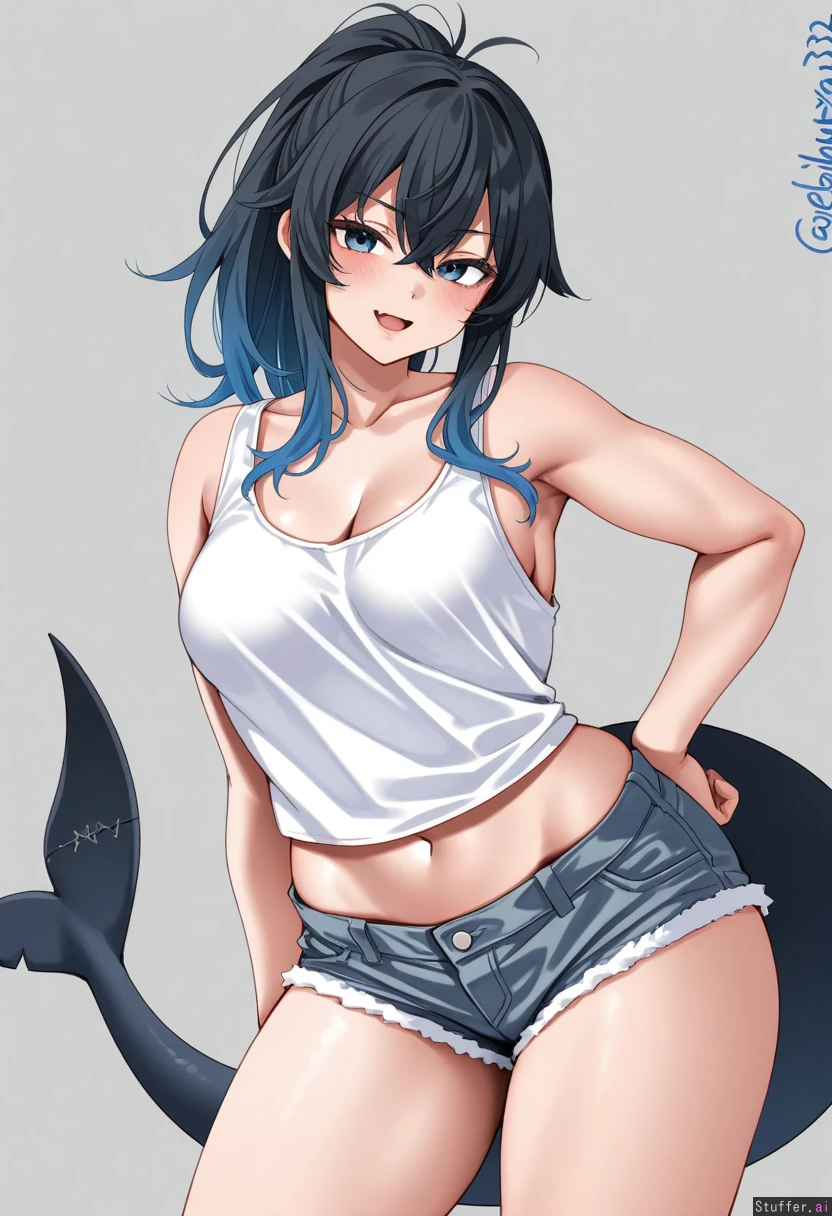 (by ebifurya:1.2), cowboy view, simple background, 1woman, (larger female), mature, bags under eyes, blue eyes, blue hair, black hair, gradient hair, multicolored hair, long hair, ponytail, fluffy hair, crossed bangs, black tail, shark tail, muscular, muscular legs, thick thighs, skin fang, wide hips, medium breasts, white shirt, tank top, gray shorts, denim shorts, looking at viewer