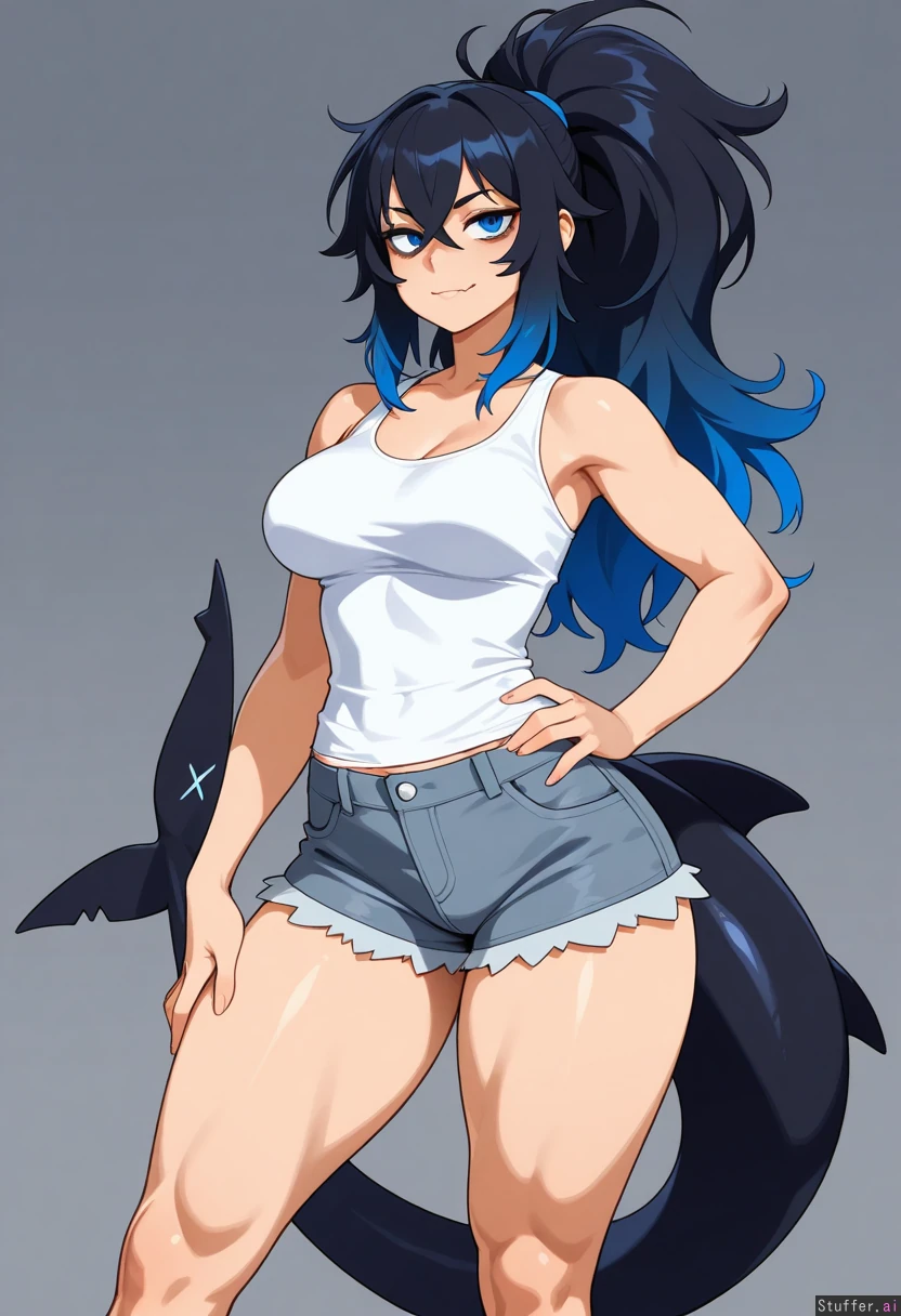 (by combos_n_doodles:0.56), (by kajinman:0.67), (by asanagi:0.55), cowboy view, simple background, 1woman, (larger female), mature, bags under eyes, blue eyes, blue hair, black hair, gradient hair, multicolored hair, long hair, ponytail, fluffy hair, crossed bangs, black tail, shark tail, muscular, muscular legs, thick thighs, skin fang, wide hips, medium breasts, white shirt, tank top, gray shorts, denim shorts, looking at viewer