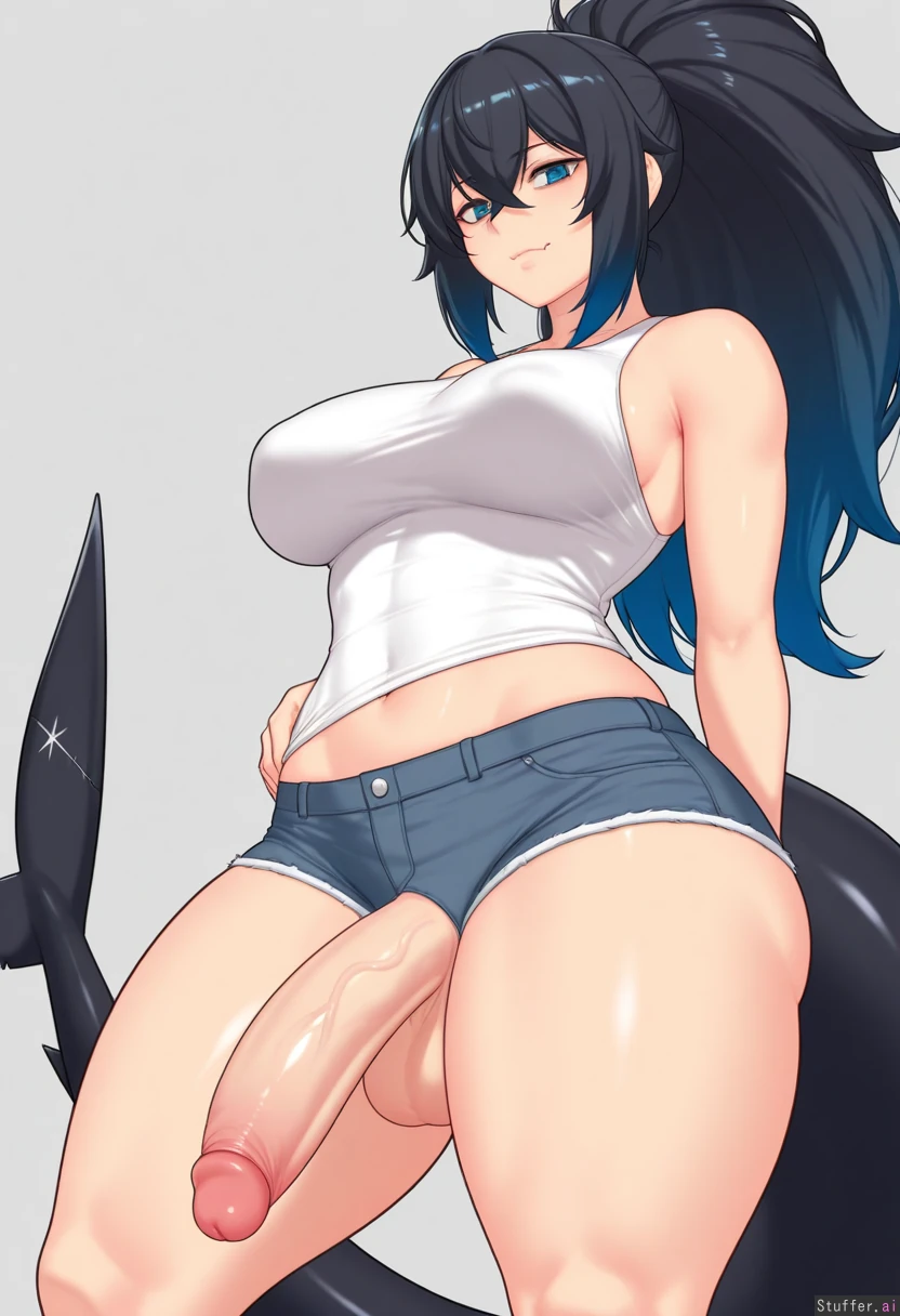 (by aster_crowley:1.2), cowboy view, simple background, 1woman, (larger female), intersex, (mature female), bags under eyes, blue eyes, blue hair, black hair, gradient hair, multicolored hair, long hair, ponytail, fluffy hair, crossed bangs, black tail, shark tail, muscular, muscular legs, thick thighs, skin fang, wide hips, medium breasts, white shirt, tank top, gray shorts, denim shorts, looking at viewer, huge penis, small testicles, clothed