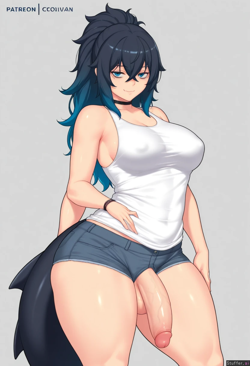 (by aster_crowley:1.2), cowboy view, simple background, 1woman, (larger female), intersex, (mature female), bags under eyes, blue eyes, blue hair, black hair, gradient hair, multicolored hair, long hair, ponytail, fluffy hair, crossed bangs, black tail, shark tail, muscular, muscular legs, thick thighs, skin fang, wide hips, medium breasts, white shirt, tank top, gray shorts, denim shorts, looking at viewer, huge penis, flaccid, small testicles, under clothes,