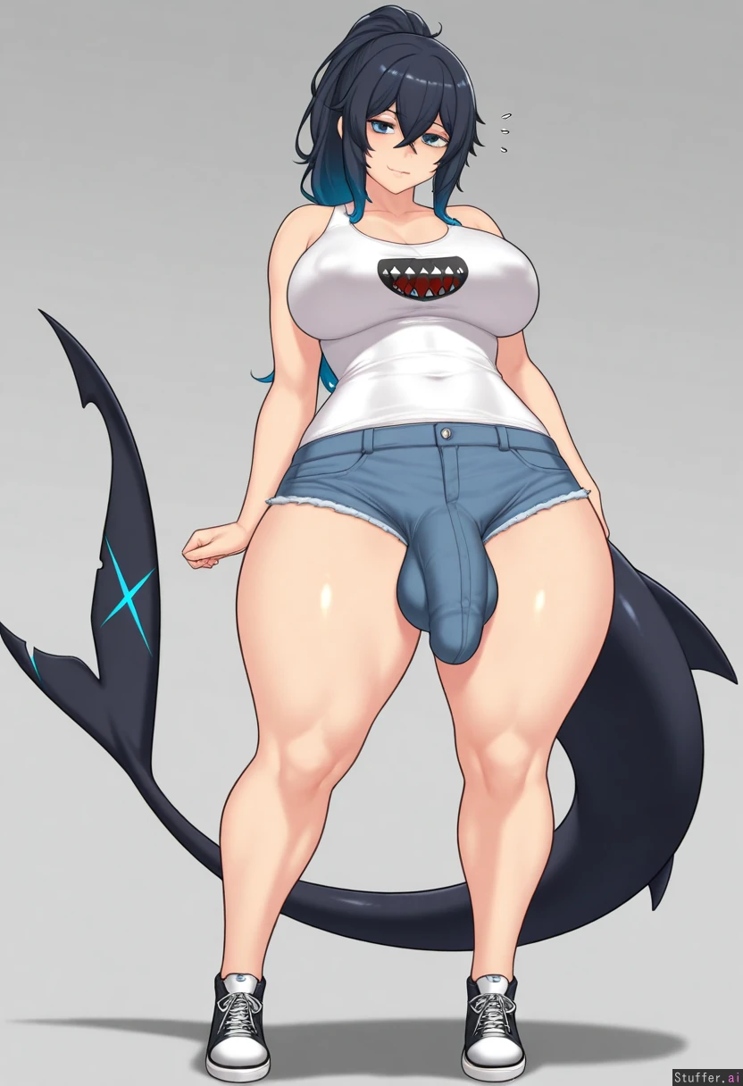 (by aster_crowley:1.2), cowboy view, simple background, 1woman, (larger female), intersex, (mature female), bags under eyes, blue eyes, blue hair, black hair, gradient hair, multicolored hair, long hair, ponytail, fluffy hair, crossed bangs, black tail, shark tail, muscular, muscular legs, thick thighs, skin fang, wide hips, medium breasts, white shirt, tank top, gray shorts, denim shorts, looking at viewer, huge penis, flaccid, tiny testicles, genitalia in clothes,