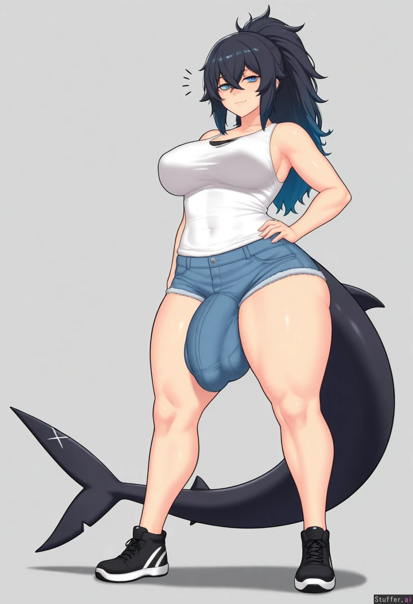(by aster_crowley:1.2), cowboy view, simple background, 1woman, (larger female), intersex, (mature female), bags under eyes, blue eyes, blue hair, black hair, gradient hair, multicolored hair, long hair, ponytail, fluffy hair, crossed bangs, black tail, shark tail, muscular, muscular legs, thick thighs, skin fang, wide hips, medium breasts, white shirt, tank top, gray shorts, denim shorts, black sneakers, looking at viewer, huge penis, flaccid, tiny balls, genitalia in clothes,