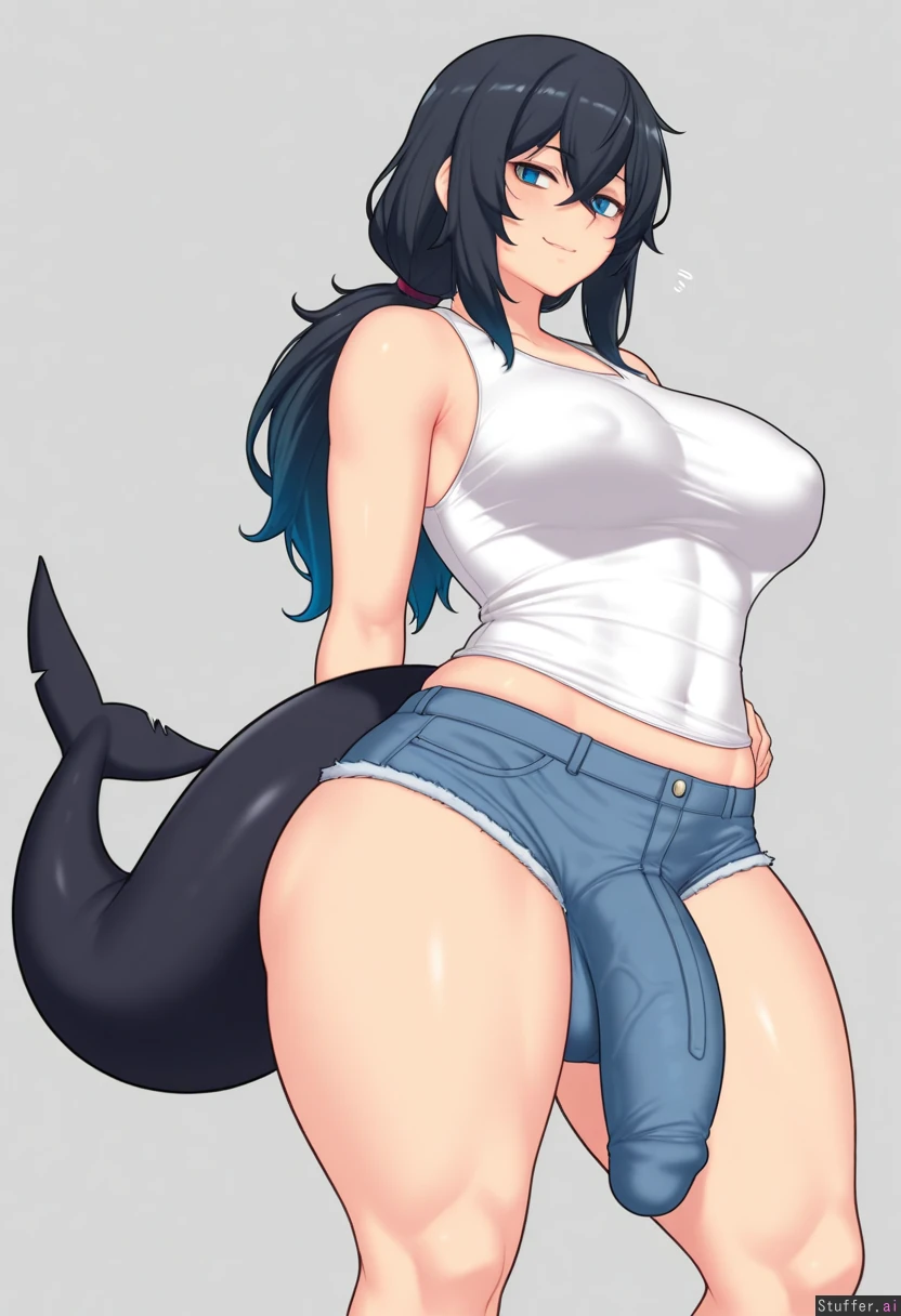 (by aster_crowley:1.2), cowboy shot, simple background, 1woman, (larger female), intersex, (mature female), bags under eyes, blue eyes, blue hair, black hair, gradient hair, multicolored hair, long hair, ponytail, fluffy hair, crossed bangs, black tail, shark tail, muscular, muscular legs, thick thighs, skin fang, wide hips, medium breasts, white shirt, tank top, gray shorts, denim shorts, black sneakers, looking at viewer, huge penis, flaccid, tiny balls, genitalia in clothes,