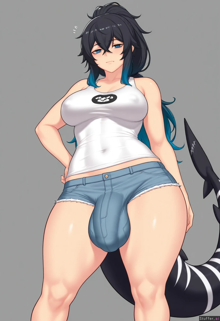 (by aster_crowley:1.2), cowboy shot, simple background, 1woman, (larger female), intersex, (mature female), bags under eyes, blue eyes, blue hair, black hair, gradient hair, multicolored hair, long hair, ponytail, fluffy hair, crossed bangs, black tail, shark tail, muscular, white stripes on tail, muscular legs, thick thighs, skin fang, wide hips, medium breasts, white shirt, tank top, gray shorts, denim shorts, black sneakers, looking at viewer, huge penis, flaccid, tiny balls, genitalia in clothes,