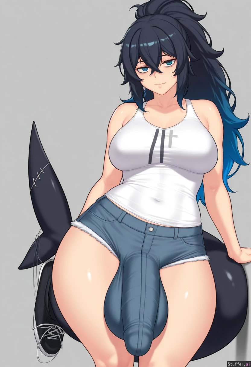 (by aster_crowley:1.2), cowboy shot, simple background, 1woman, (larger female), intersex, (mature female), bags under eyes, blue eyes, blue hair, black hair, gradient hair, multicolored hair, long hair, ponytail, fluffy hair, crossed bangs, black tail, shark tail, muscular, white stripes on tail, muscular legs, thick thighs, skin fang, wide hips, medium breasts, white shirt, tank top, gray shorts, denim shorts, black sneakers, looking at viewer, huge penis, flaccid, huge balls, genitalia in clothes,