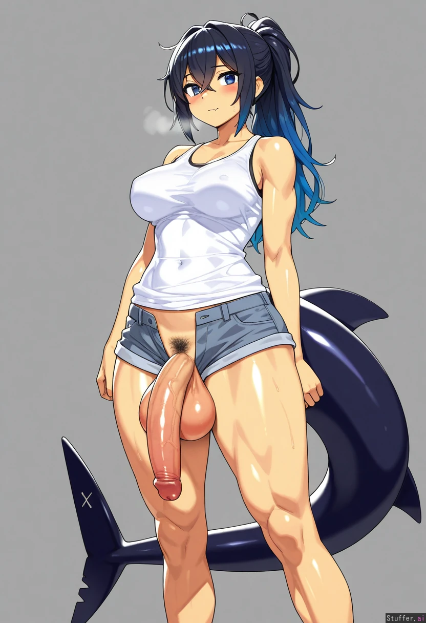 (by munashi_mujou:1.2), cowboy shot, simple background, 1woman, (larger female), intersex, (mature female), bags under eyes, blue eyes, blue hair, black hair, gradient hair, multicolored hair, long hair, ponytail, fluffy hair, crossed bangs, black tail, shark tail, muscular, blue stripes on tail, (muscular legs:1.4), thick thighs, skin fang, wide hips, medium breasts, white shirt, tank top, gray shorts, denim shorts, black sneakers, seductive, looking at viewer, huge ass, huge penis, flaccid, huge balls, open shorts, pubic hair, heavy balls,