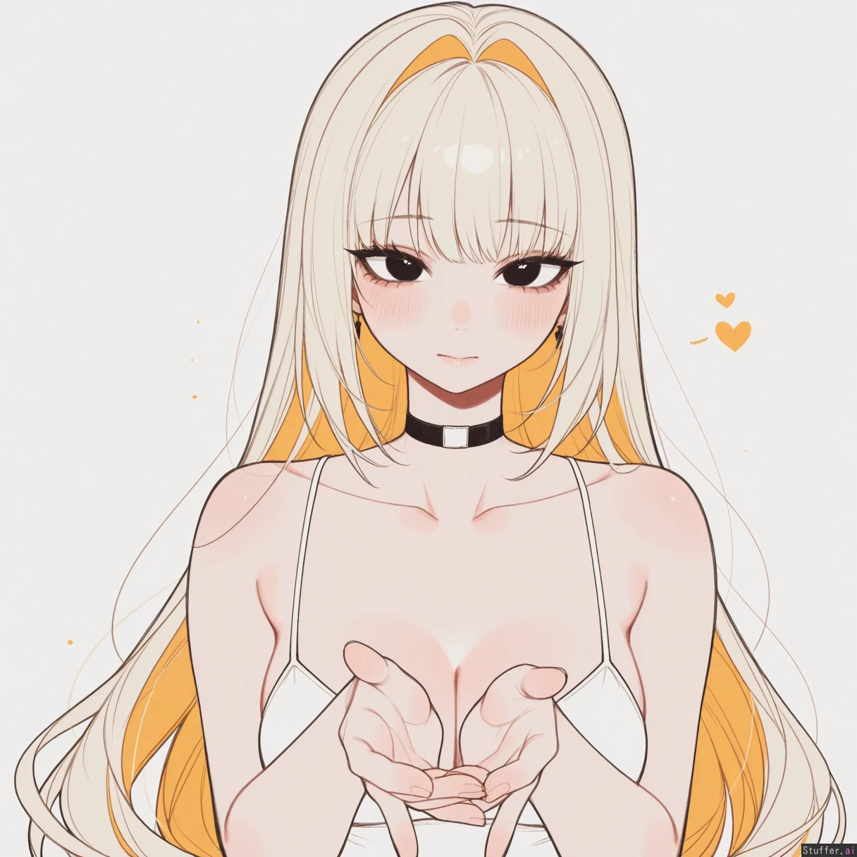 Blanc(nikke), solo, usa3710692(artist), KAMII MOMORU(artist), kobayasi-kobako(artist), thick lines, High quality, (Masterpiece), (warm colors), (semi-realistic human anatomy), (perfect anatomy), (perfect hands), (flat colors:1.3), 1girl, Long wavy orange hair, side bangs, black eyes Wearing white camisole, not visible hands