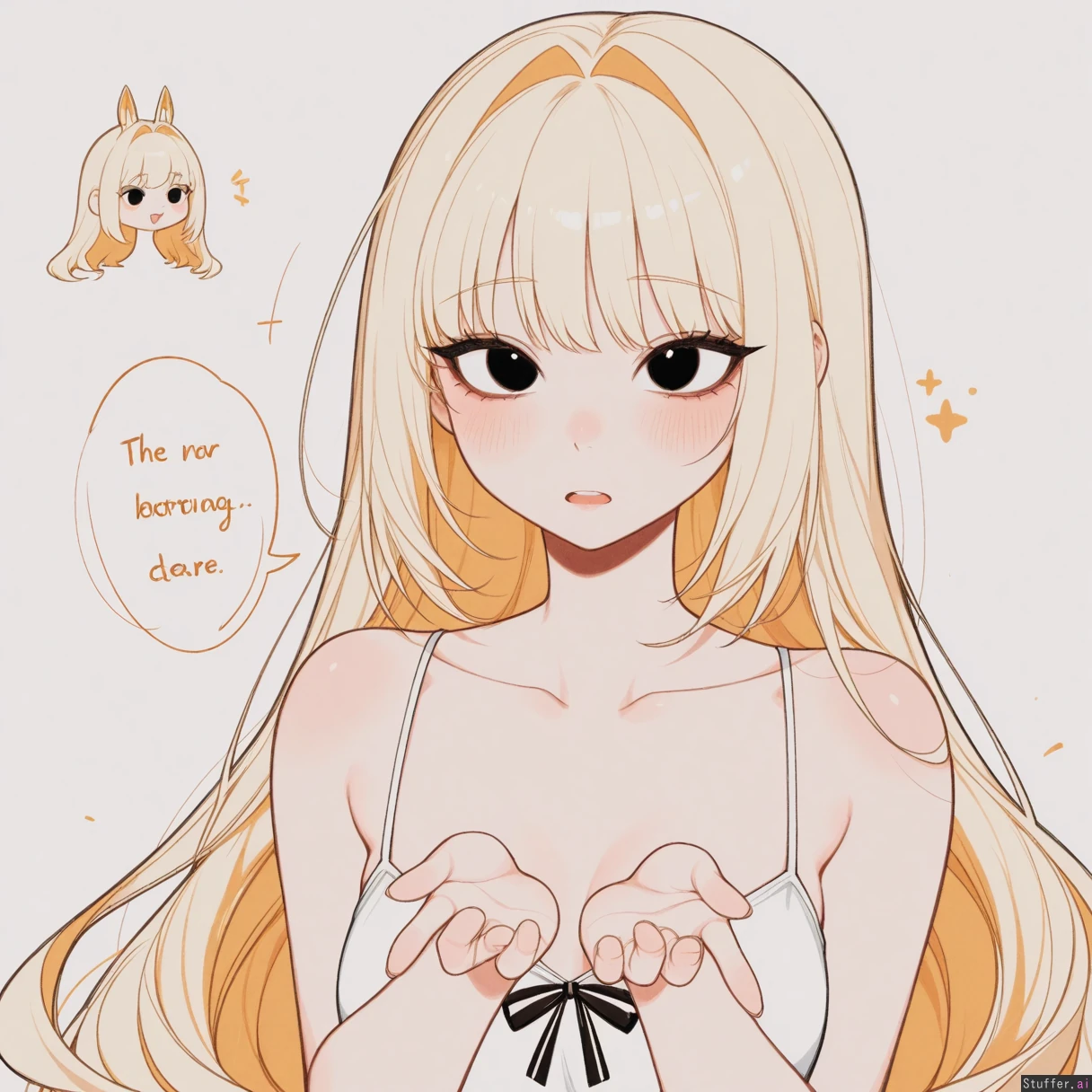 Blanc(nikke), solo, usa3710692(artist), KAMII MOMORU(artist), kobayasi-kobako(artist), thick lines, High quality, (Masterpiece), (warm colors), (semi-realistic human anatomy), (perfect anatomy), (perfect hands), (flat colors:1.3), 1girl, Long wavy orange hair, side bangs, black eyes Wearing white camisole, not visible hands, casual expression, casual photo, no hands