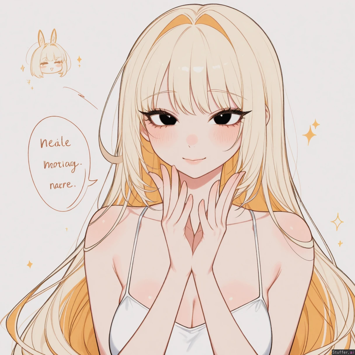 Blanc(nikke), solo, usa3710692(artist), KAMII MOMORU(artist), kobayasi-kobako(artist), thick lines, High quality, (Masterpiece), (warm colors), (semi-realistic human anatomy), (perfect anatomy), (perfect hands), (flat colors:1.3), 1girl, Long wavy orange hair, side bangs, black eyes Wearing white camisole, casual expression, casual photo, mature