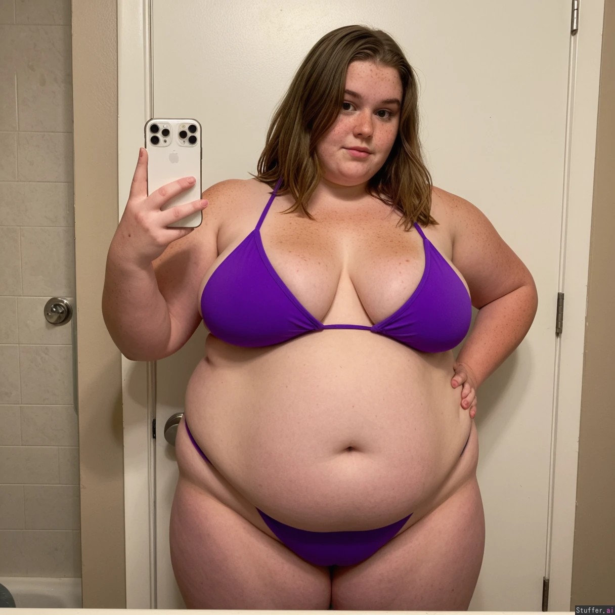 Instagram picture. Cute attractive tall 19 year old dutch athlete girl, ((have young beautiful face)), brown shoulder length hair, freckles on her face. Morbidly obese, enormous wide hips, wide curvy body, fat belly pouch. She is wearing a purple bikini. She is standing in a bathroom. She is holding a normal white phone in one hand and one hand touching the wall.