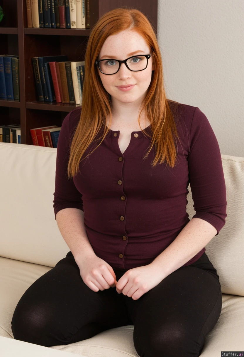 18, ginger, cute, pretty, modest librarian clothes, glasses, sitting on couch modestly, (chubby_belly:0.5), tight top with stretched buttons