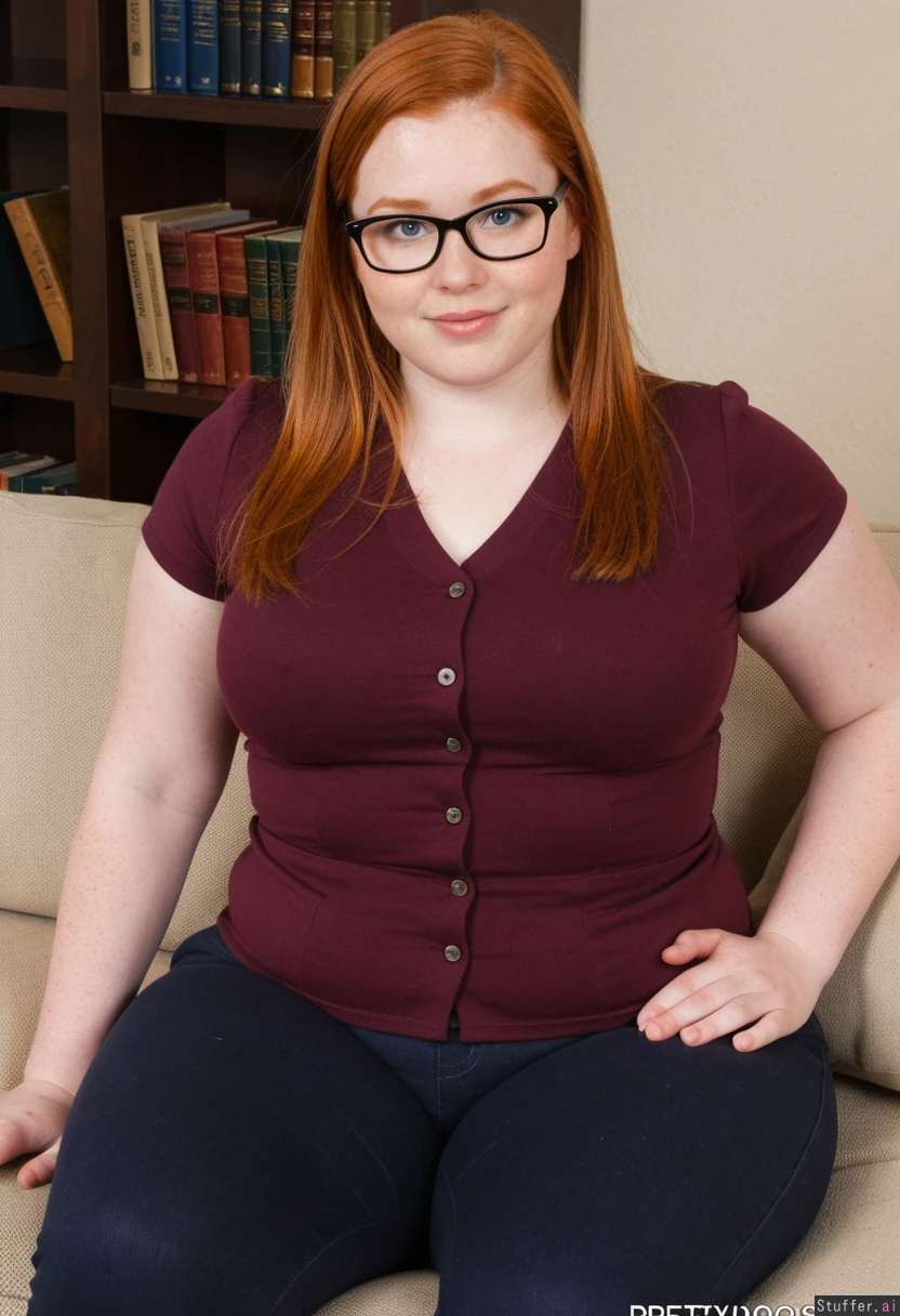 18, ginger, cute, pretty, modest librarian clothes, glasses, sitting on couch modestly, (chubby_belly:1.0), very tight top with very stretched buttons