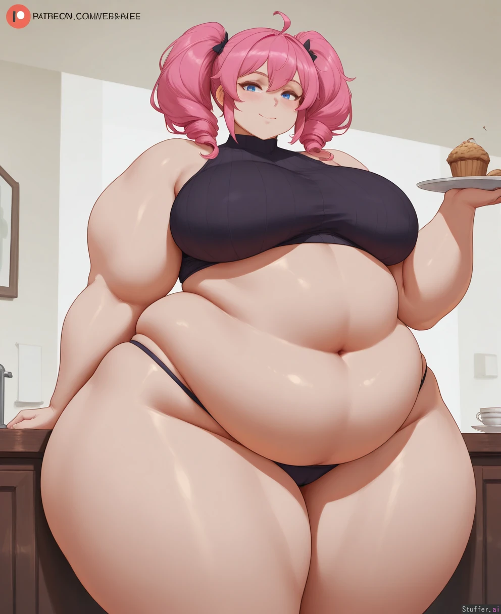 cutesexyrobutts, coffeeslice, (obese:1.6), (chubby belly:1.9), (thick thighs:2), (wide hips:2), pale skin, blue_eyes, human, perfect human anatomy, big breasts, (fat arms:1.4), pink hair, milf, araneesama, panties, crop top, (chubby face:1.2), looking_at_viewer, dessert, (blushing), smile, pigtails, muffin_top, love_handles, (flabby), greedy, feedee, weight_gain, cellulite, hanging_belly