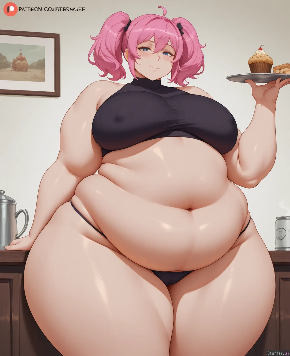 cutesexyrobutts, coffeeslice, (obese:1.1), (chubby belly:2.2), (thick thighs:2), (wide hips:2), pale skin, blue_eyes, human, perfect human anatomy, big breasts, (fat arms:1.4), pink hair, milf, araneesama, panties, crop top, (chubby face:1.2), looking_at_viewer, dessert, (blushing), smile, pigtails, muffin_top, love_handles, (flabby), greedy, feedee, weight_gain, cellulite, hanging_belly