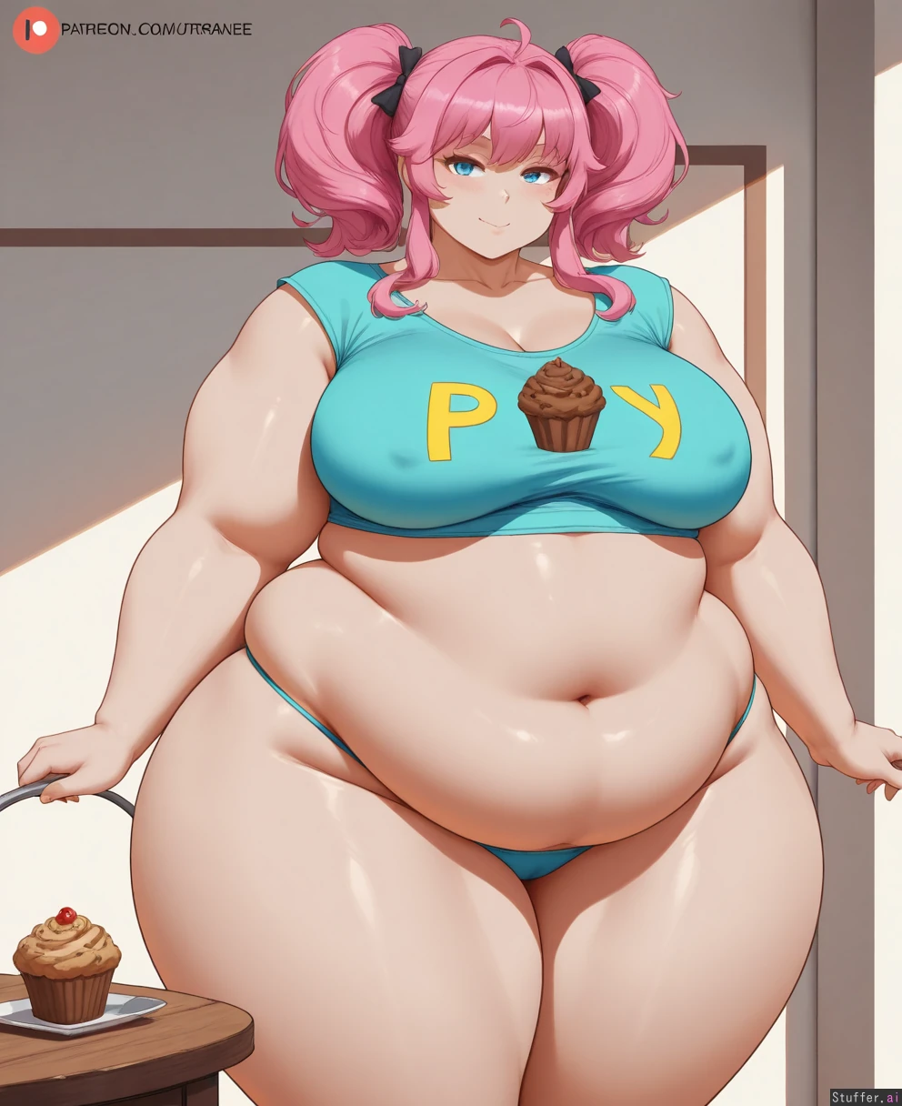 cutesexyrobutts, coffeeslice, (obese:1.1), (chubby belly:2), (thick thighs:2), (wide hips:2), pale skin, blue_eyes, human, perfect human anatomy, big breasts, (fat arms:1.4), pink hair, milf, araneesama, panties, crop top, (chubby face:1.2), looking_at_viewer, dessert, (blushing), smile, pigtails, muffin_top, love_handles, (flabby), greedy, feedee, weight_gain, cellulite, hanging_belly