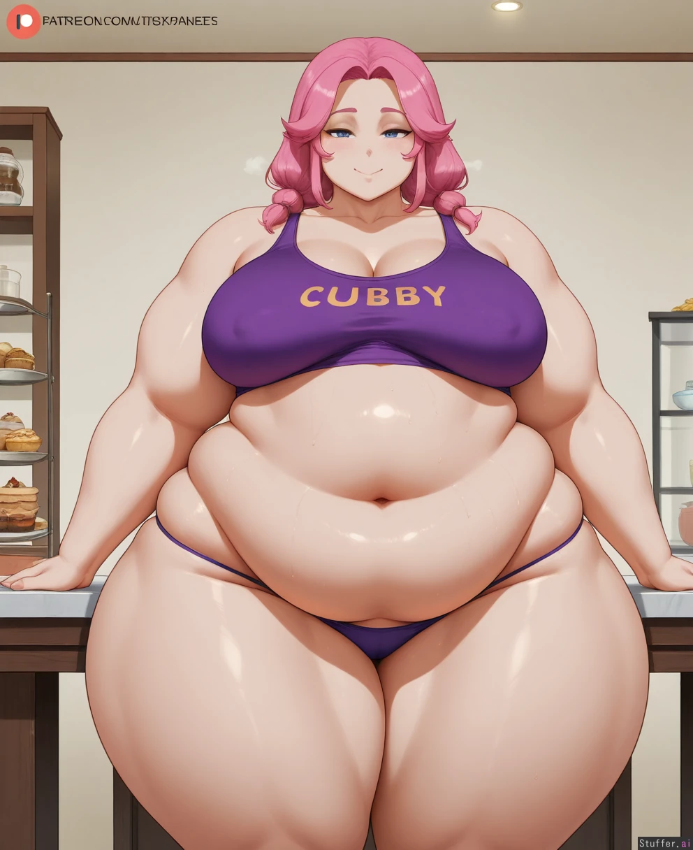 cutesexyrobutts, coffeeslice, (obese:1.0), (chubby belly:2), (thick thighs:2), (wide hips:2), pale skin, blue_eyes, human, perfect human anatomy, big breasts, (fat arms:1.4), pink hair, milf, araneesama, panties, crop top, (chubby face:1.2), looking_at_viewer, dessert, (blushing), smile, pigtails, muffin_top, love_handles, (flabby), greedy, feedee, weight_gain, cellulite, (hanging_belly), madartraven, (heavy_breathing), sweaty,