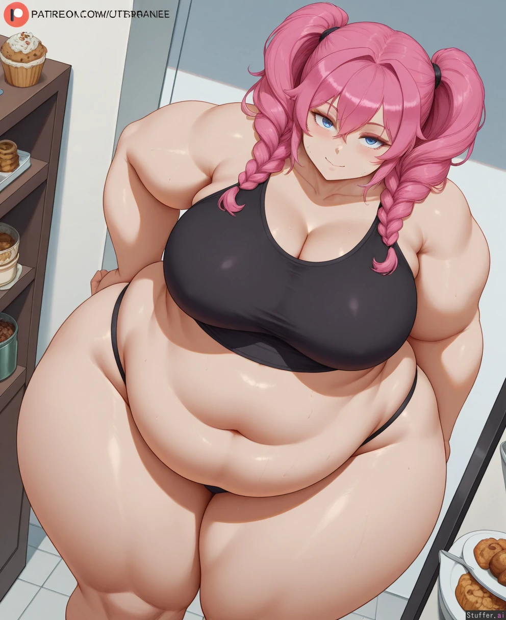 cutesexyrobutts, coffeeslice, (obese:1.2), (chubby belly:2), (thick thighs:2), (wide hips:2), pale skin, blue_eyes, human, perfect human anatomy, big breasts, (fat arms:1.4), pink hair, milf, araneesama, panties, crop top, (chubby face:1.2), looking_at_viewer, dessert, (blushing), smile, pigtails, muffin_top, love_handles, (flabby), greedy, feedee, weight_gain, cellulite, (hanging_belly), madartraven, (heavy_breathing), sweaty, out_of_breath, from_above, from_side, weight_conscious