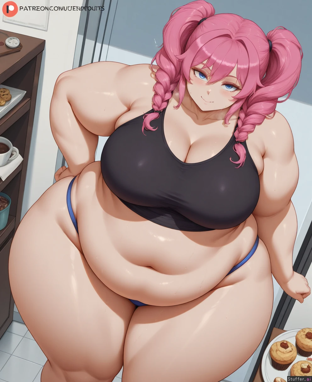 cutesexyrobutts, coffeeslice, (obese:1.4), (chubby belly:2), (thick thighs:2), (wide hips:2), pale skin, blue_eyes, human, perfect human anatomy, big breasts, (fat arms:1.4), pink hair, milf, araneesama, panties, crop top, (chubby face:1.2), looking_at_viewer, dessert, (blushing), smile, pigtails, muffin_top, love_handles, (flabby), greedy, feedee, weight_gain, cellulite, (hanging_belly), madartraven, (heavy_breathing), sweaty, out_of_breath, from_above, from_side, weight_conscious,