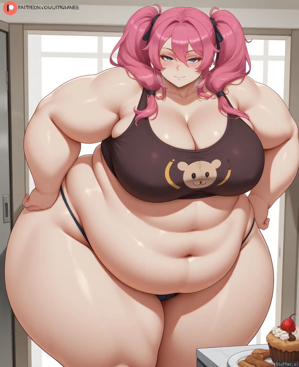 cutesexyrobutts, coffeeslice, (obese:1.9), (chubby belly:2), (thick thighs:2), (wide hips:2), pale skin, blue_eyes, human, perfect human anatomy, big breasts, (fat arms:1.4), pink hair, milf, araneesama, panties, crop top, (chubby face:1.2), looking_at_viewer, dessert, (blushing), smile, pigtails, muffin_top, love_handles, (flabby), greedy, feedee, weight_gain, cellulite, (hanging_belly), madartraven, (heavy_breathing), sweaty, out_of_breath, from_above, from_side, weight_conscious,