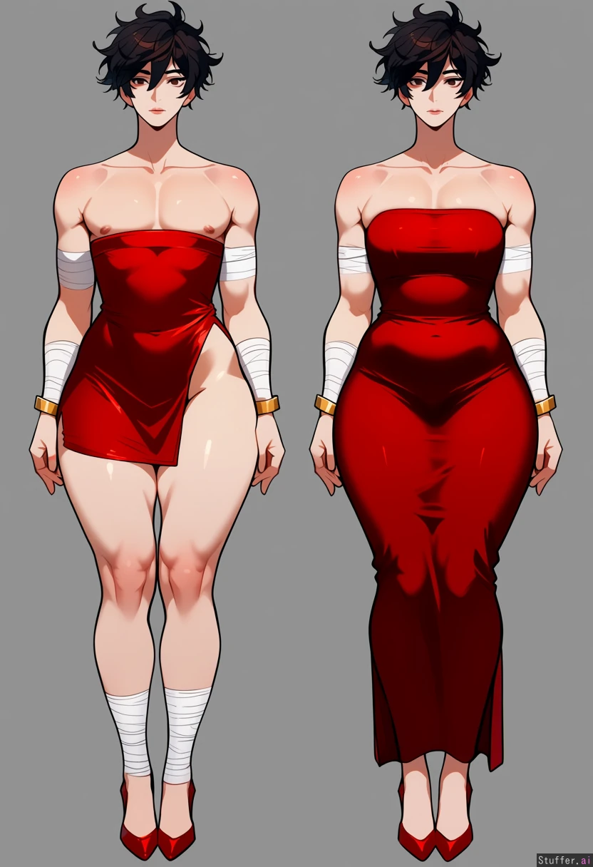 Appearance: Fair skin, short slightly wavy messy dark hair, dark brown eyes, thin eyebrows, slightly plump lips. Body: Slim and slender, hairless, wide hips and thick, soft thighs. Clothing: He usually wears a red silk dress, has bandages on his arms and legs, red high heels, and gold bracelets