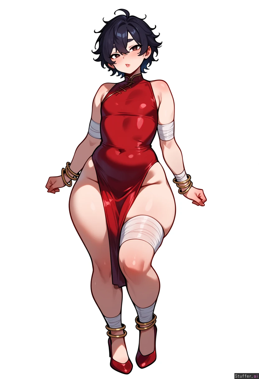 Appearance: Fair skin, short slightly wavy messy dark hair, dark brown eyes, thin eyebrows, slightly plump lips. Body: Slim and slender, hairless, wide hips and thick, soft thighs. Clothing: He usually wears a red silk dress, has bandages on his arms and legs, red high heels, and gold bracelets