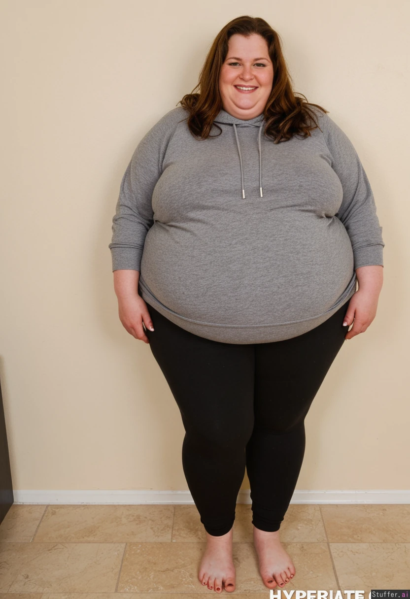Huge fat hyper obese mature woman with a massive hyper obese belly smiling brown hair wearing black leggings and a gray hoodie barefoot standing