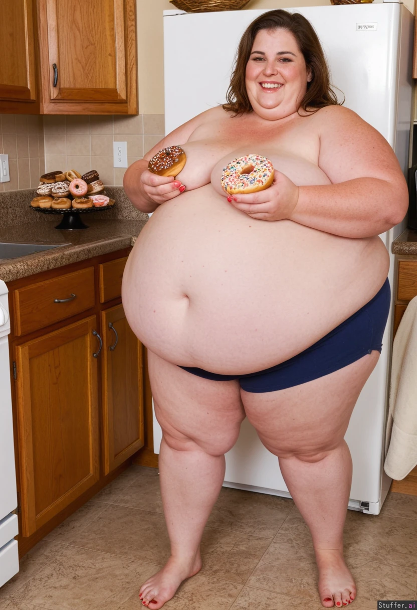 Huge fat hyper obese mature woman with a massive hyper obese belly smiling brown hair barefoot standing eating doughnuts