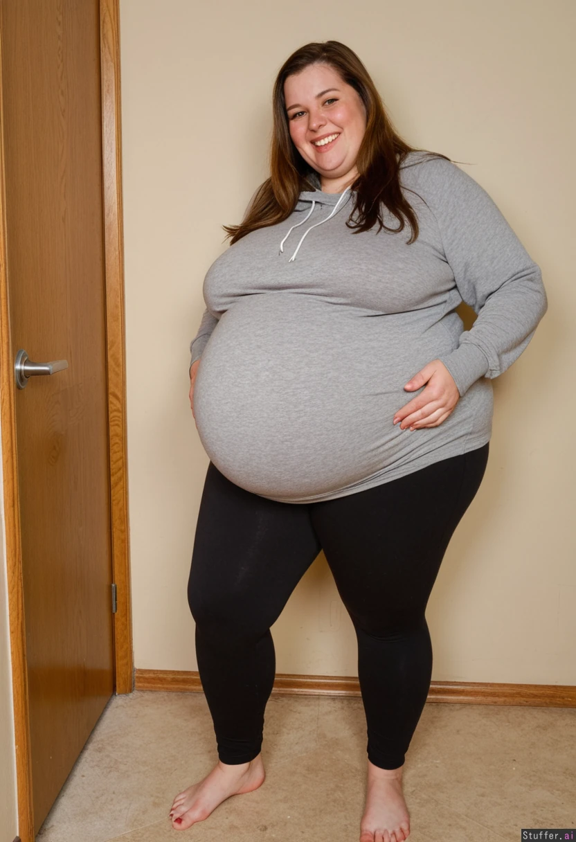 Huge fat hyper obese mature pregnant woman with a massive hyper obese belly smiling brown hair wearing black leggings and a gray hoodie barefoot standing