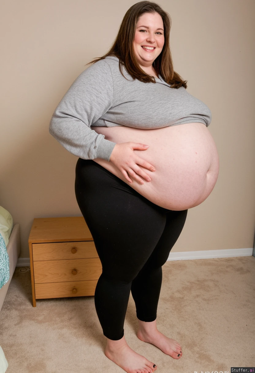 Huge fat hyper obese mature pregnant woman with a massive hyper obese belly smiling brown hair wearing black leggings and a gray hoodie barefoot standing