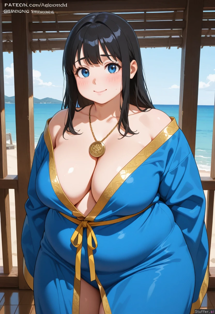 best_quality, high_rating, perfect_anatomy, detailed_face, beautiful_face, solo_female, straight_hair, black_hair, eyelashes, blue_eyes, glistening_eyes, solid_bangs, overweight, fat_face, chubby_cheeks, fat_arms, double_chin, fat_neck, huge_hips, fat_belly, fat_thighs, cleavage, medium_breasts, narrow_shoulders, blushing, nervous_smile, seaside_town, afternoon, priestess_robes, blue_robes, bronze_medallion, folded_clothes, looking_to_the_side
