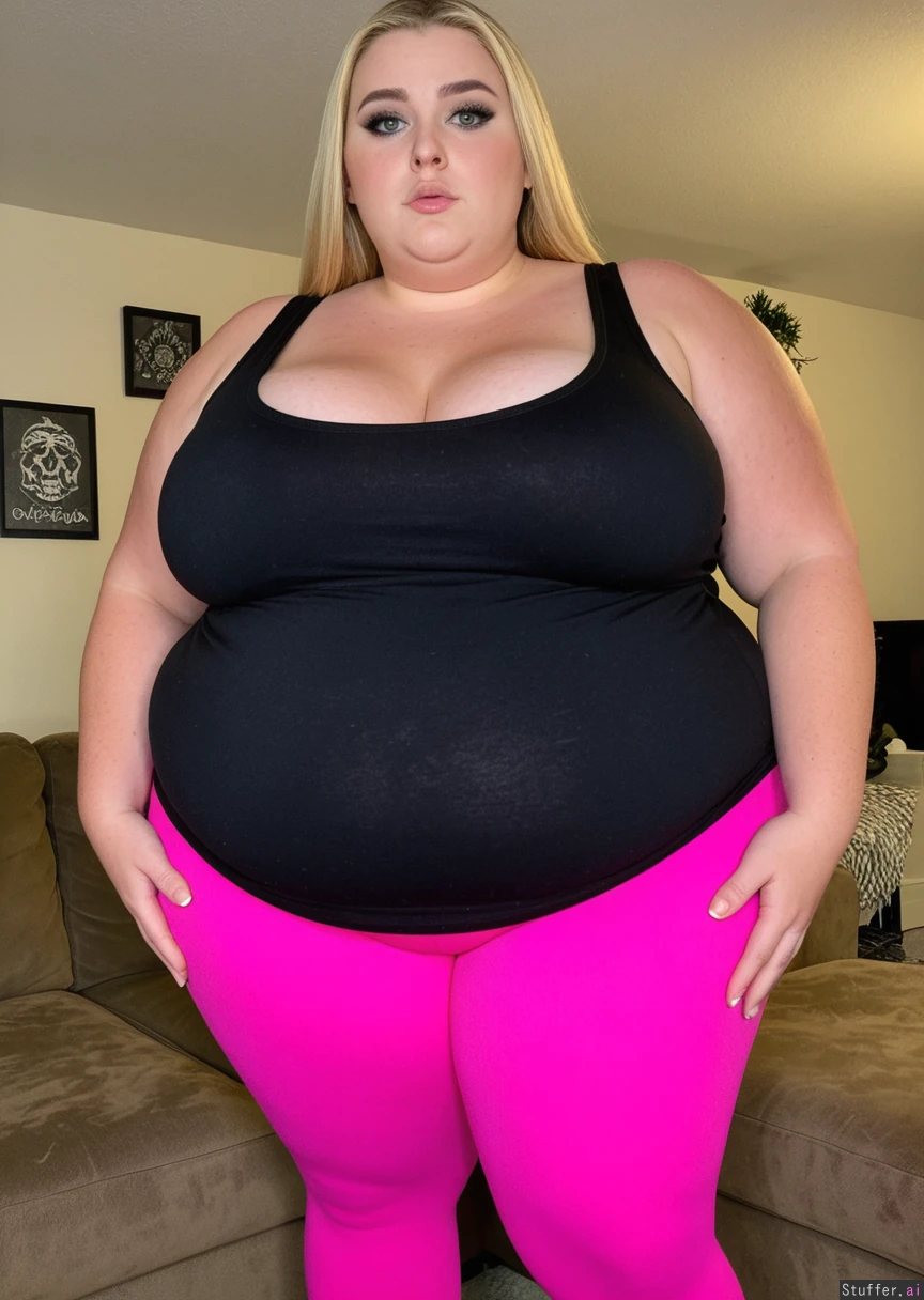 (Realistic, extreme 8k detail, warm lighting, very high quality candid photo), (side_view:1.6), profile, Very long natural blonde hair, (smooth glistening deep tan skin with freckles), big almond shaped blue eyes, high cheekbones, fat around face, fat round cheeks, double chin, huge plump bimbo lips, manicured eyebrows, full face of bimbo makeup, heavy smokey eye makeup, (tattoos, piercings), Mature 35 year old SSBBW goth bimbo, (((morbidly obese))), (ssbbw goth bimbo is a gargantuan doughy blob of fat:1.8), (gigantic distended saggy spherical belly), sagging fat belly hanging down to her knees, cellulite, round underbelly, (gigantomastia), massive saggy breasts, ((bottom heavy anatomy, gigantic round fat shelf butt, massively wide fat saddlebag hips and thighs)), fat arms and legs, very wide and stout body, (completely enveloped in thick layers of fat), ((Fully clothed wearing an oversized long tight black tanktop showing cleavage and tight pink leggings:1.6)), midriff, (bottom of tanktop covering top of belly), Standing in her cozy living room, looking up at the viewer, furniture, plants, art, (massive out of control weight gain), hands on the front of her belly, (shocked expression on here face),