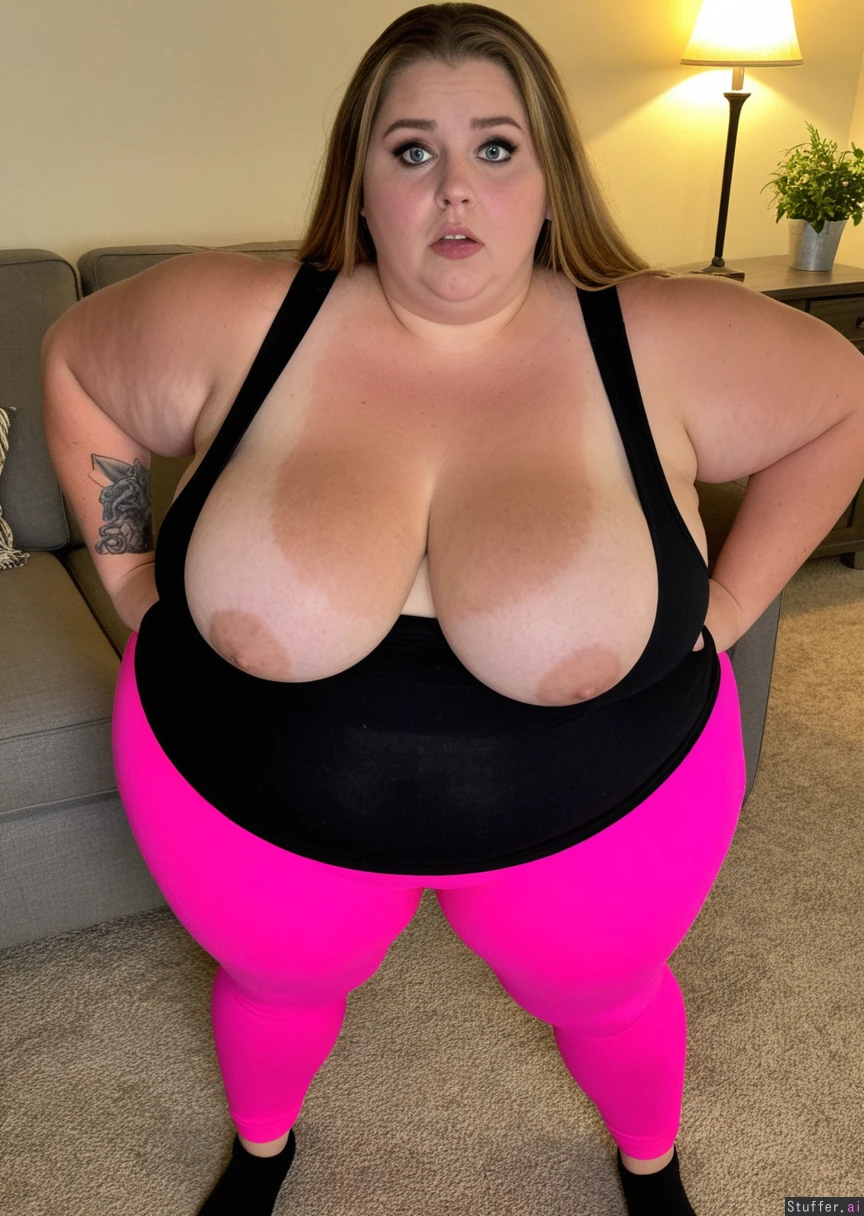 (Realistic, extreme 8k detail, warm lighting, very high quality candid photo), (side_view_from_above:1.6), profile, Very long natural blonde hair, (smooth glistening deep tan skin with freckles), big almond shaped blue eyes, high cheekbones, fat around face, fat round cheeks, double chin, huge plump bimbo lips, manicured eyebrows, full face of bimbo makeup, heavy smokey eye makeup, (tattoos, piercings), Mature 35 year old SSBBW goth bimbo, (((morbidly obese))), (ssbbw goth bimbo is a gargantuan doughy blob of fat:1.8), (gigantic distended saggy spherical belly), sagging fat belly hanging down to her knees, cellulite, round underbelly, (gigantomastia), massive saggy breasts, ((bottom heavy anatomy, gigantic round fat shelf butt, massively wide fat saddlebag hips and thighs)), fat arms and legs, very wide and stout body, (completely enveloped in thick layers of fat), ((Fully clothed wearing an oversized long tight black tanktop showing cleavage and tight pink leggings:1.6)), midriff, (bottom of tanktop covering top of belly), Standing in her cozy living room, looking up at the viewer, furniture, plants, art, (massive out of control weight gain), hands on the front of her belly, (((shocked expression on her face))),