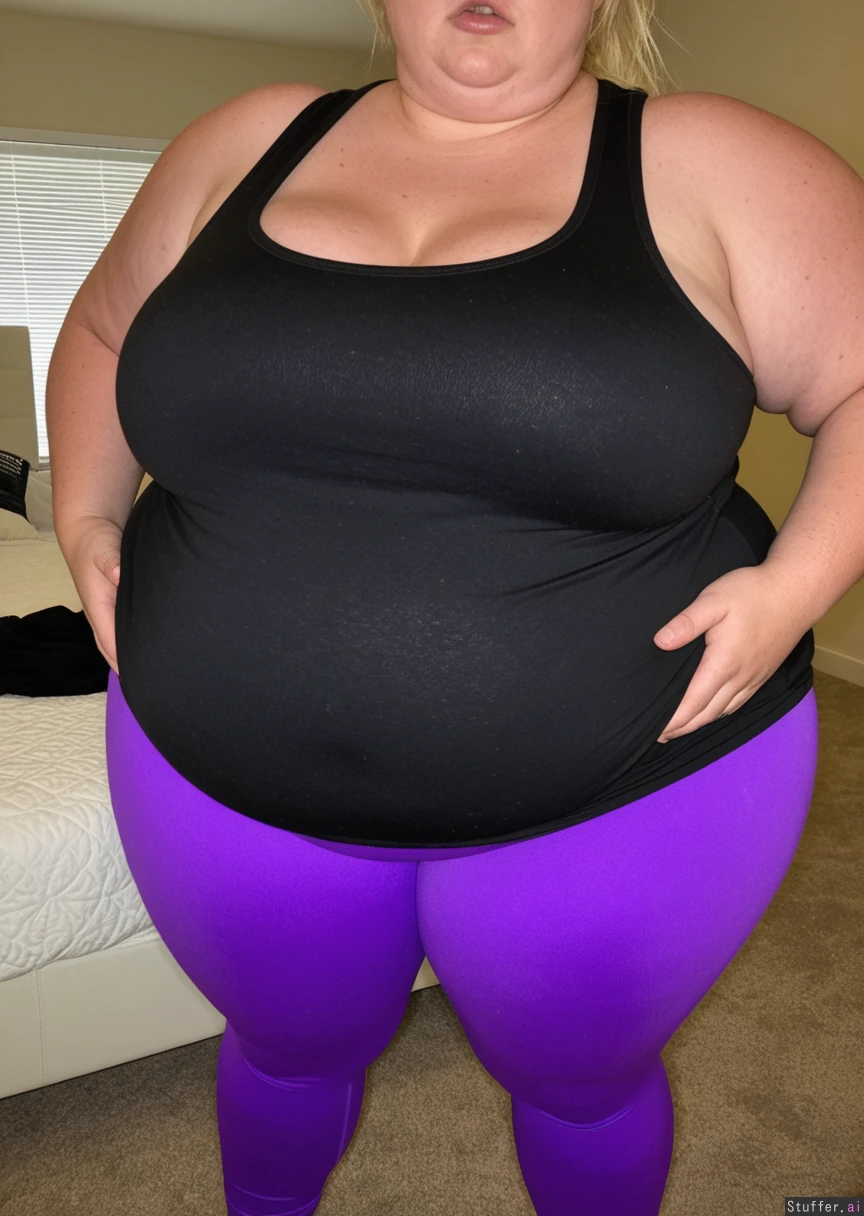(Realistic, extreme 8k detail, warm lighting, very high quality candid photo), (side_view_from_above:1.6), profile, Very long natural blonde hair, (smooth glistening deep tan skin with freckles), big almond shaped blue eyes, high cheekbones, fat around face, fat round cheeks, double chin, huge plump bimbo lips, manicured eyebrows, full face of bimbo makeup, heavy smokey eye makeup, (tattoos, piercings), Mature 35 year old SSBBW goth bimbo, (((morbidly obese))), (ssbbw goth bimbo is a gargantuan doughy blob of fat:1.8), (((gigantic distended saggy spherical belly))), sagging fat belly hanging down to her knees, cellulite, round underbelly, (gigantomastia), massive saggy breasts, ((bottom heavy anatomy, gigantic round fat shelf butt, massively wide fat saddlebag hips and thighs)), fat arms and legs, very wide and stout body, (completely enveloped in thick layers of fat), ((Fully clothed wearing an oversized long tight black tanktop showing cleavage and tight purple leggings covering the bottom of her belly:1.6)), midriff, (bottom of tanktop covering top of belly), Standing in her cozy living room, looking up at the viewer, furniture, plants, art, (massive out of control weight gain), hands on the front of her belly, (((shocked expression on her face))),