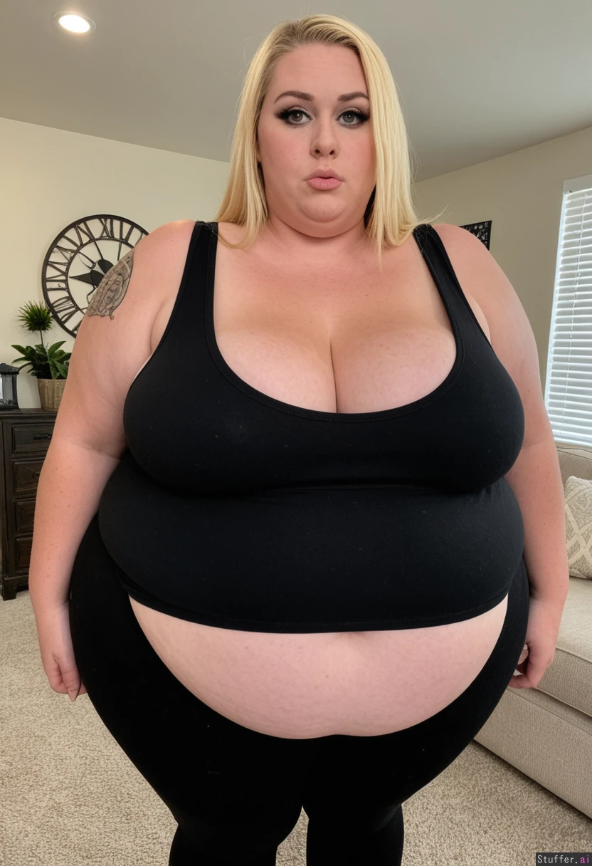 (Realistic, extreme 8k detail, warm lighting, very high quality candid photo), (side_view_from_above:1.6), profile, (Very long natural blonde hair), (smooth glistening deep tan skin with freckles), big almond shaped blue eyes, high cheekbones, fat around face, fat round cheeks, double chin, huge plump bimbo lips, manicured eyebrows, full face of bimbo makeup, heavy smokey eye makeup, (tattoos, piercings), Massively fat mature 35 year old SSBBW goth bimbo, (((morbidly obese))), (((ssbbw goth bimbo is a gargantuan doughy blob of fat:1.8))), (((gigantic distended saggy spherical belly poking out out of her tanktop))), sagging fat belly hanging down to her knees, cellulite, round underbelly, (gigantomastia), massive saggy breasts, ((bottom heavy anatomy, gigantic round fat shelf butt, massively wide fat saddlebag hips and thighs)), fat arms and legs, very wide and stout body, ((completely enveloped in thick layers of sagging fat)), (Fully clothed wearing an oversized long tight black tanktop showing cleavage and tight purple leggings covering the bottom of her belly:1.5), midriff, ((bottom of tanktop showing midriff)), Standing in her cozy living room, looking up at the viewer, furniture, plants, art, (((shocked expression on her face))),