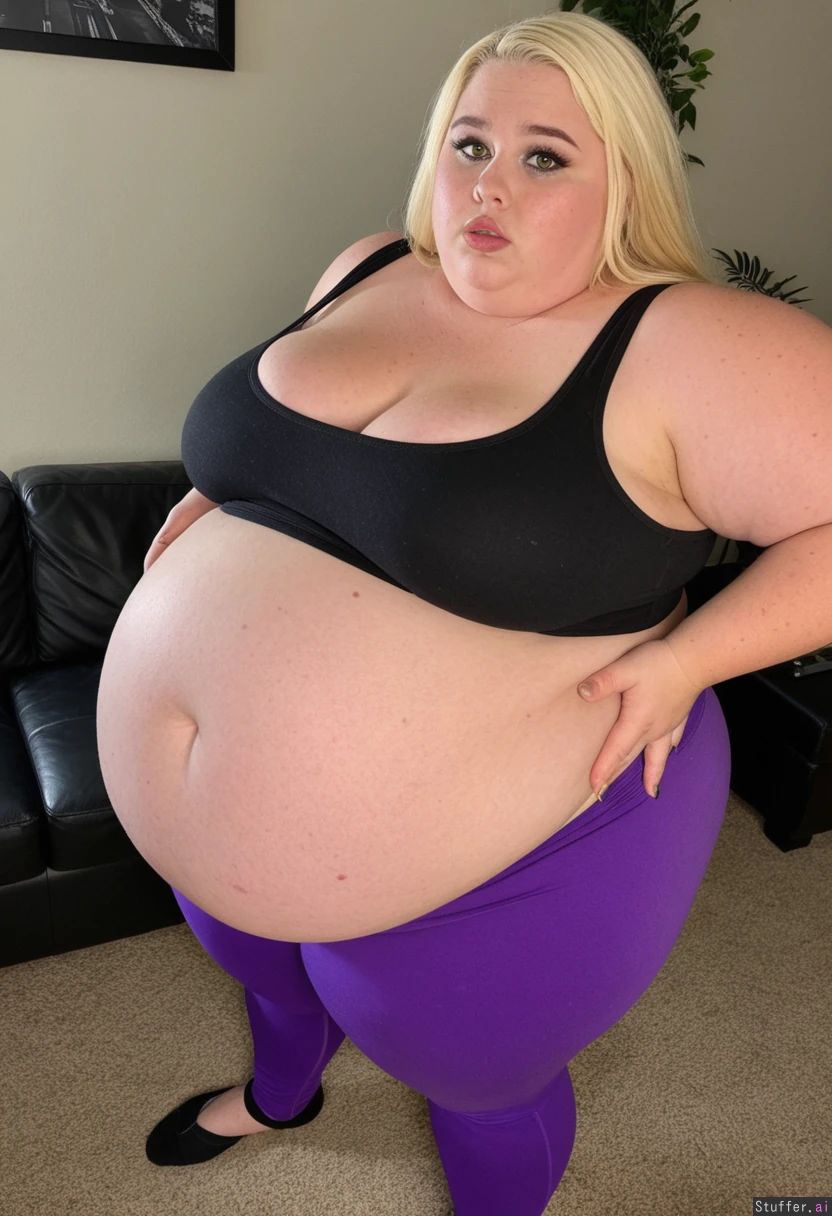 (Realistic, extreme 8k detail, warm lighting, very high quality candid photo), (side_view_from_above:1.6), profile, colorful, (Very long natural blonde hair), (smooth glistening deep tan skin with freckles), big almond shaped blue eyes, high cheekbones, fat around face, fat round cheeks, double chin, huge plump bimbo lips, manicured eyebrows, full face of bimbo makeup, heavy smokey eye makeup, (tattoos, piercings), Massively fat mature 35 year old SSBBW goth bimbo, (((morbidly obese))), (((ssbbw goth bimbo is a gargantuan doughy blob of fat:1.8))), (((gigantic distended saggy spherical belly poking out out of her tanktop))), sagging fat belly hanging down to her knees, cellulite, round underbelly, (gigantomastia), massive saggy breasts, ((bottom heavy anatomy, gigantic round fat shelf butt, massively wide fat saddlebag hips and thighs)), fat arms and legs, very wide and stout body, ((completely enveloped in thick layers of sagging fat)), (Fully clothed wearing an oversized long tight black tanktop showing cleavage and tight purple leggings covering the bottom of her belly:1.5), midriff, ((bottom of tanktop showing midriff)), Standing in her cozy living room, looking up at the viewer, furniture, plants, art, (((shocked expression on her face))),