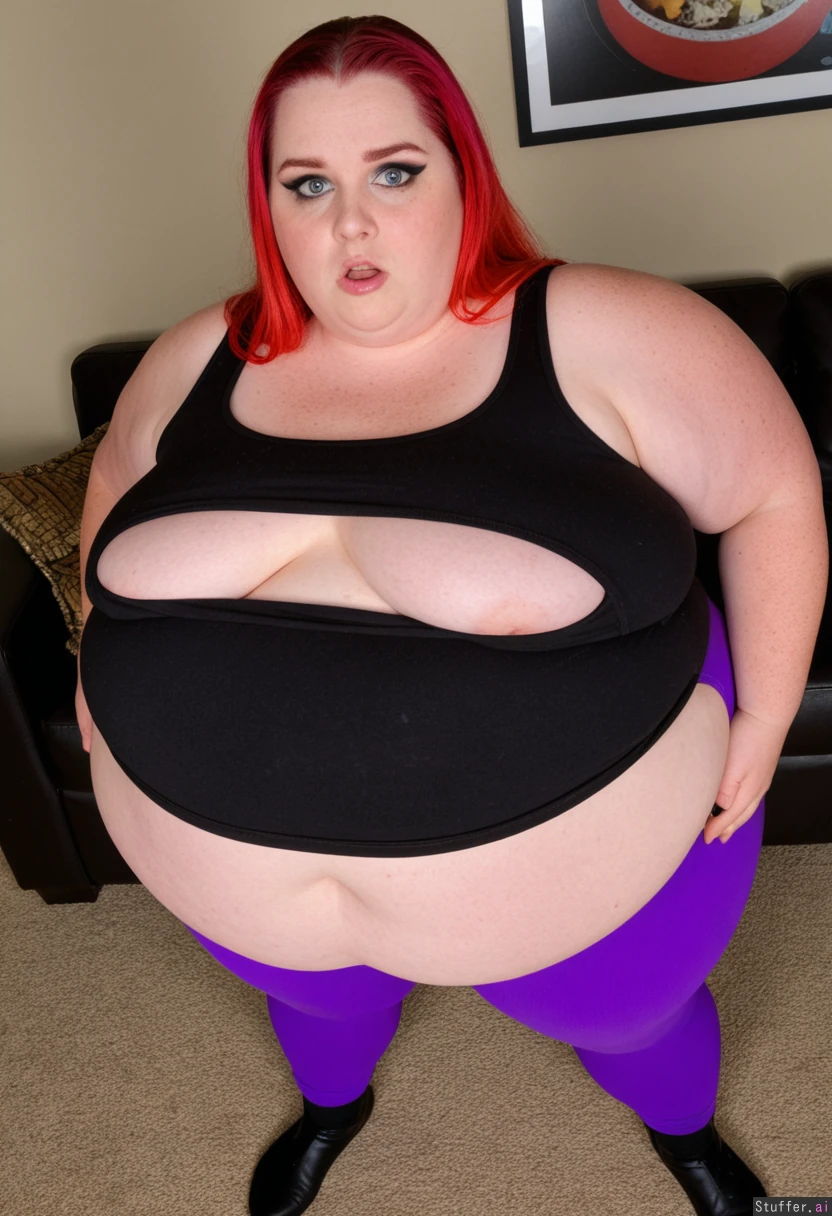 (Realistic, extreme 8k detail, warm lighting, very high quality candid photo), (view_from_above:1.6), profile, colorful, (Very long natural blonde hair), (smooth glistening deep tan skin with freckles), big almond shaped blue eyes, high cheekbones, (Anna Nichole Smith's face), fat around face, fat round cheeks, double chin, huge plump bimbo lips, manicured eyebrows, full face of bimbo makeup, heavy smokey eye makeup, (tattoos, piercings), Massively fat mature 35 year old SSBBW goth bimbo, (((morbidly obese))), (((ssbbw goth bimbo is a gargantuan doughy blob of fat:1.8))), (((gigantic distended saggy spherical belly poking out out of her tanktop))), sagging fat belly hanging down to her knees, cellulite, round underbelly, (massive saggy breasts), ((bottom heavy anatomy, gigantic round fat shelf butt, massively wide fat saddlebag hips and thighs)), fat arms and legs, very wide and stout body, (((completely enveloped in thick layers of sagging fat))), (Fully clothed wearing an oversized long tight black tanktop showing cleavage and tight purple leggings covering the bottom of her belly:1.5), midriff, ((bottom of tanktop showing midriff)), Standing in her cozy living room, looking up at the viewer, furniture, plants, art, (((shocked expression on her face))),
