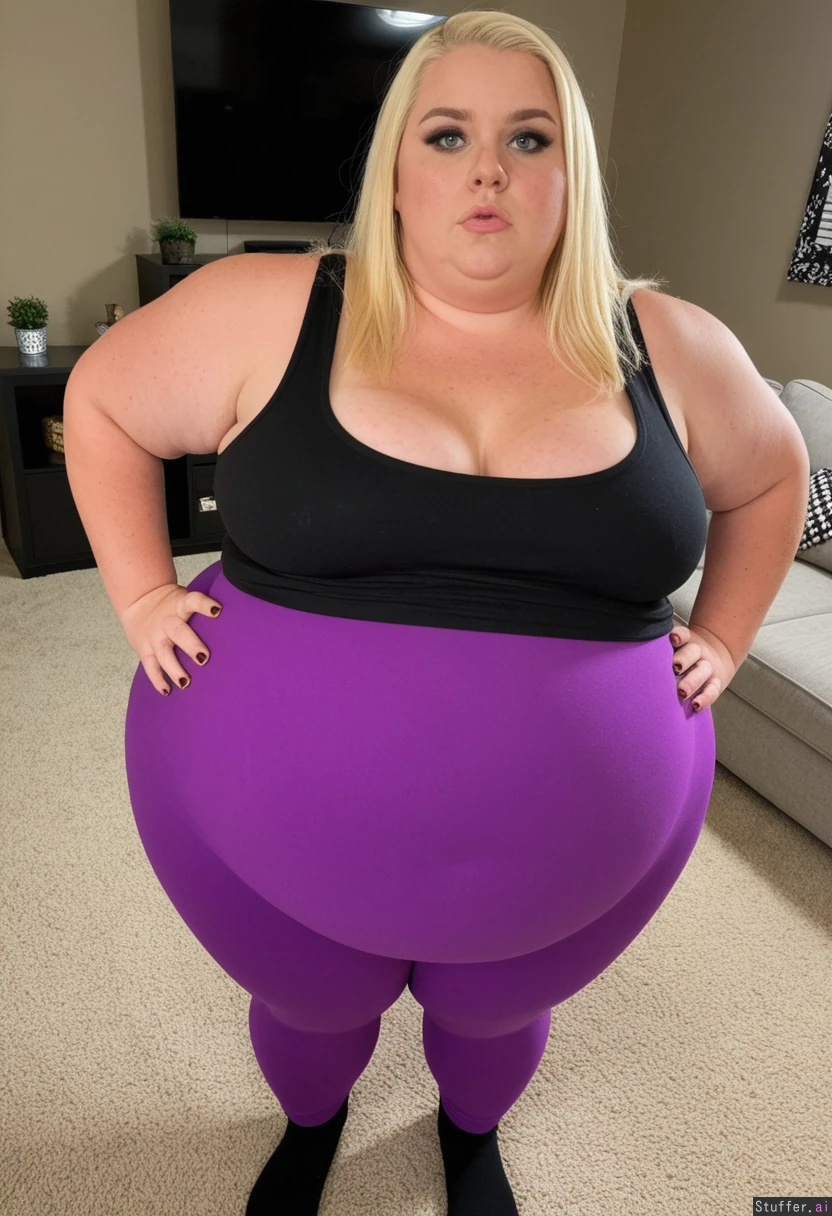 (Realistic, extreme 8k detail, warm lighting, very high quality candid photo), (view_from_above:1.6), profile, colorful, (Very long natural blonde hair), (smooth glistening deep tan skin with freckles), big almond shaped blue eyes, high cheekbones, ((Anna Nichole Smith's face)), fat around face, fat round cheeks, double chin, huge plump bimbo lips, manicured eyebrows, full face of bimbo makeup, heavy smokey eye makeup, (tattoos, piercings), Massively fat mature 35 year old SSBBW goth bimbo, (((morbidly obese))), (((ssbbw goth bimbo is a gargantuan doughy blob of fat:1.8))), (((gigantic distended saggy spherical belly poking out out of her tanktop))), sagging fat belly hanging down to her knees, cellulite, round underbelly, (massive saggy breasts), ((bottom heavy anatomy, gigantic round fat shelf butt, massively wide fat saddlebag hips and thighs)), fat arms and legs, very wide and stout body, (((completely enveloped in thick layers of sagging fat))), (Fully clothed wearing an oversized long tight black tanktop showing cleavage and tight purple leggings covering the bottom of her belly:1.5), midriff, ((bottom of tanktop showing midriff)), Standing in her cozy living room, looking up at the viewer, furniture, plants, art, (((scared expression on her face))), shocked, worried,