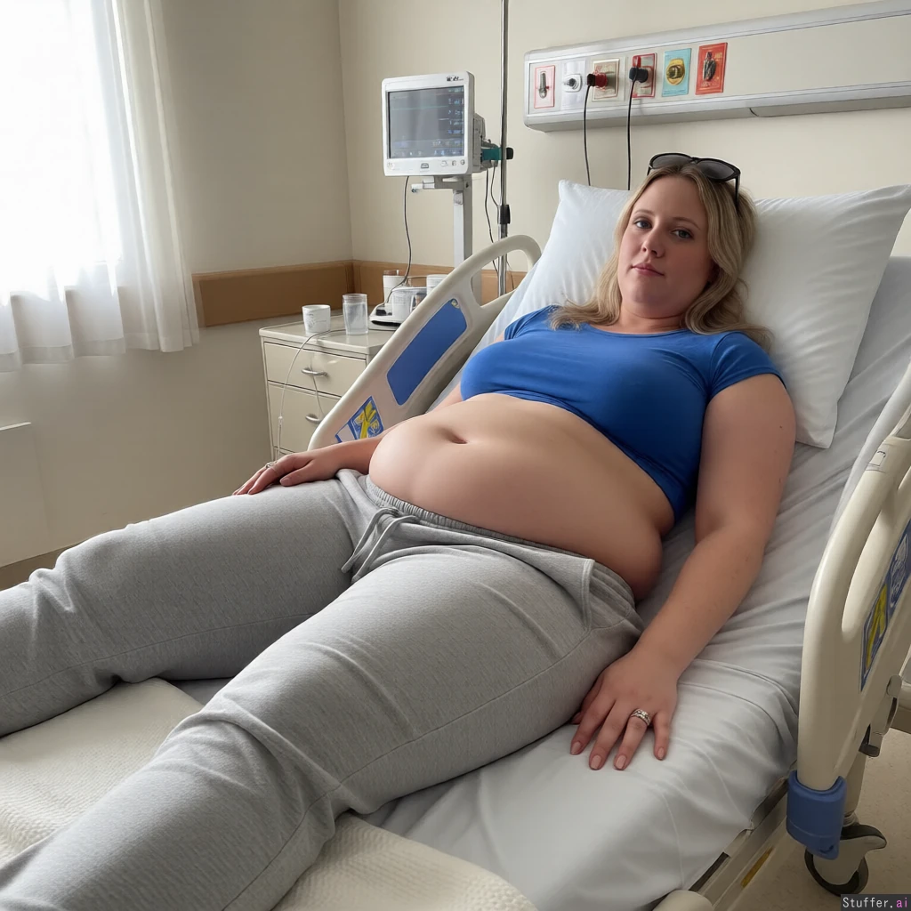 Have her laying in hospital bed, wearing sweatpants and crop top obese_body fat_legs fat_belly 20_pounds_heavier