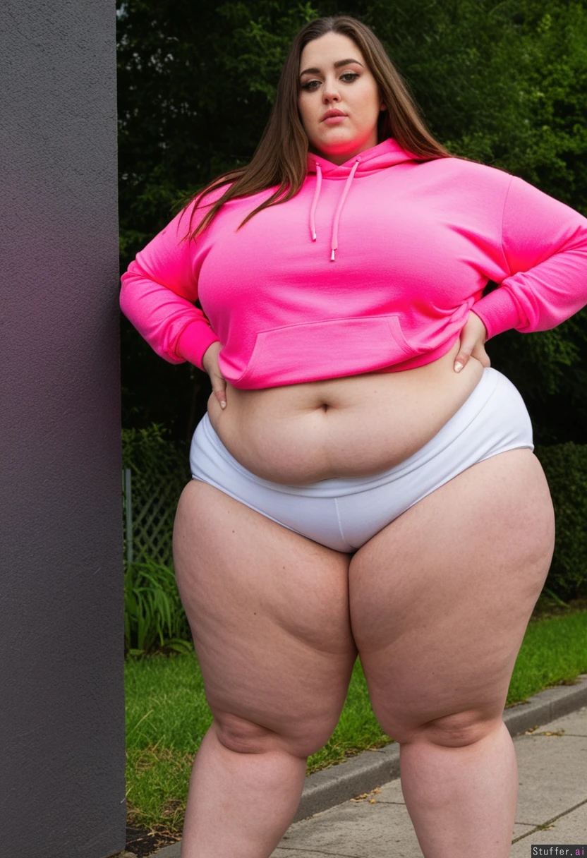 Tall curvy woman standing outside Long brown hair Green eyes Toned waist Extremely tight white shorts Pink hoodie sweatshirt (Very skinny waist) ((((Hyper_oversized very thick Hyper_Immense hyper_wide hyper_bulging hips))))