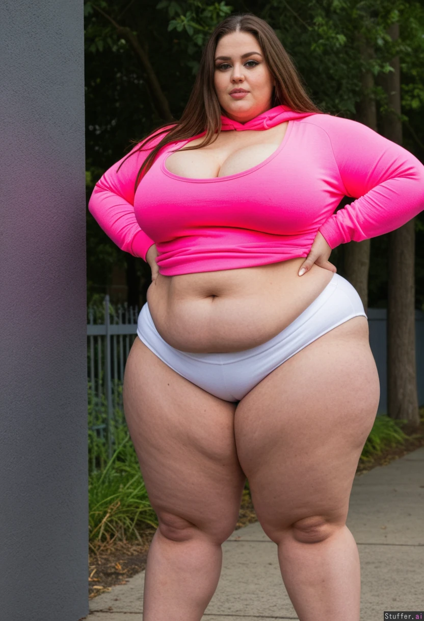 Tall curvy woman standing outside Long brown hair Green eyes Toned waist Extremely tight white shorts Pink hoodie sweatshirt (Very skinny waist) (((((Hyper_oversized very thick Hyper_Immense hyper_wide hyper_bulging hips))))) (((Bulging Cleavage showing)))