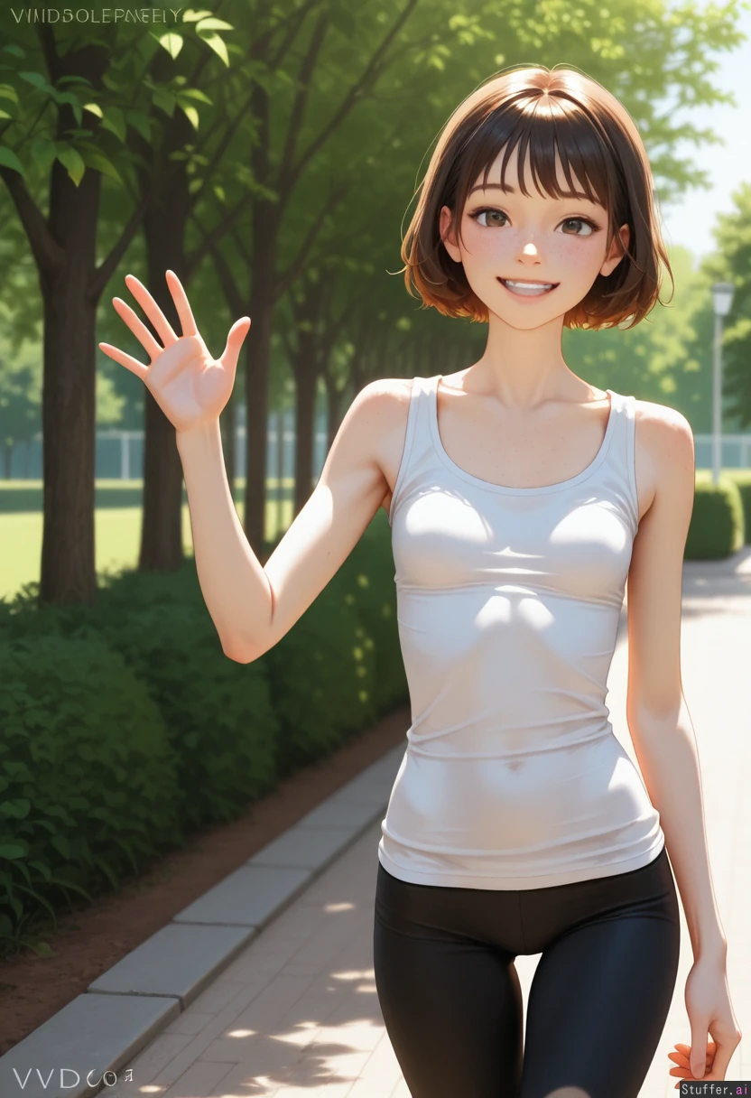 High quality, vivid details, semi realistic, natural light 20 years old, pale skin, beautiful face, brown eyes, brunette, freckles, bangs, short hair, black leggings, white tank top (Smiling, waving, walking in the park) ((Skinny)) ((Shapely breasts:1.0)) ((Wide hips:1.0)), thigh gap
