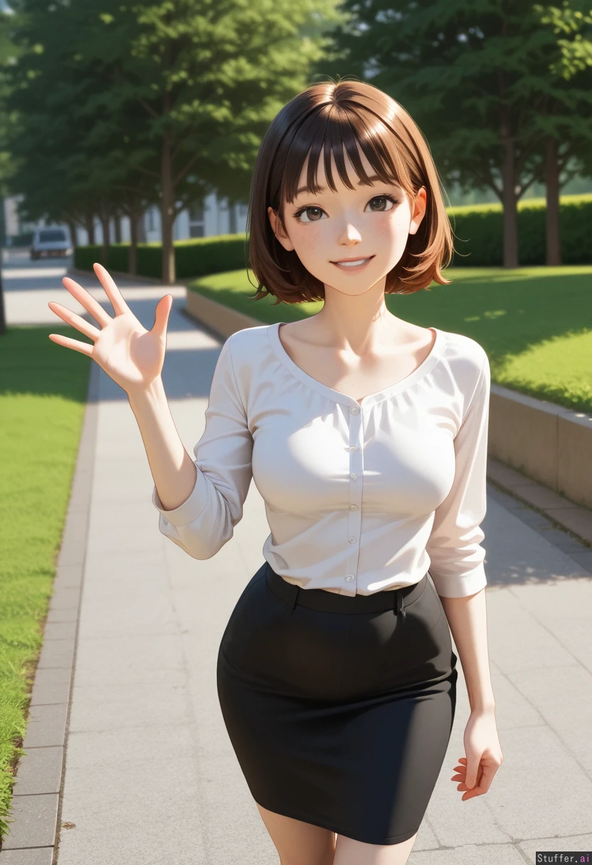 High quality, vivid details, semi realistic, natural light 20 years old, pale skin, beautiful face, brown eyes, brunette, freckles, bangs, short hair, black skirt, white blouse (Smiling, waving, walking in the park) ((Skinny)) ((Medium breasts:1.2)) ((Wide hips:1.0))