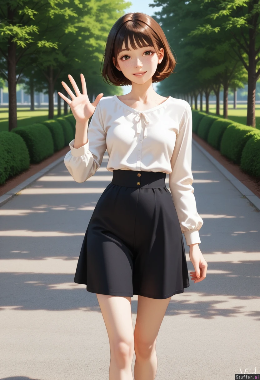 High quality, vivid details, semi realistic, natural light 20 years old, pale skin, beautiful face, brown eyes, brunette, freckles, bangs, short hair, black skirt, white blouse (Smiling, waving, walking in the park) ((Skinny)) ((Round breasts:1.0)) ((Wide hips:1.0))