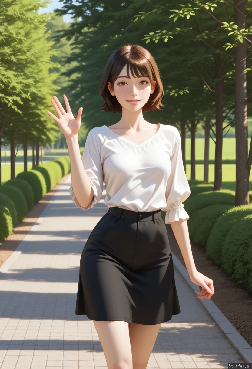 High quality, vivid details, semi realistic, natural light 20 years old, pale skin, beautiful face, brown eyes, brunette, freckles, bangs, short hair, black skirt, white blouse (Smiling, waving, walking in the park) ((Skinny)) ((Shapely breasts:1.2)) ((Wide hips:1.0))