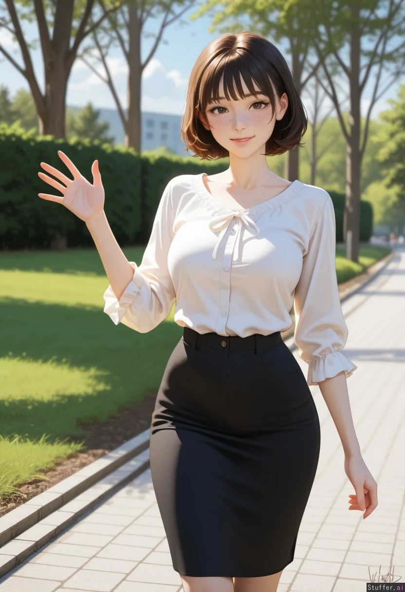 High quality, vivid details, semi realistic, natural light 20 years old, pale skin, beautiful face, brown eyes, brunette, freckles, bangs, short hair, black skirt, white blouse (Smiling, waving, walking in the park) ((Skinny)) ((Large breasts:1.0)) ((Wide hips:1.0))