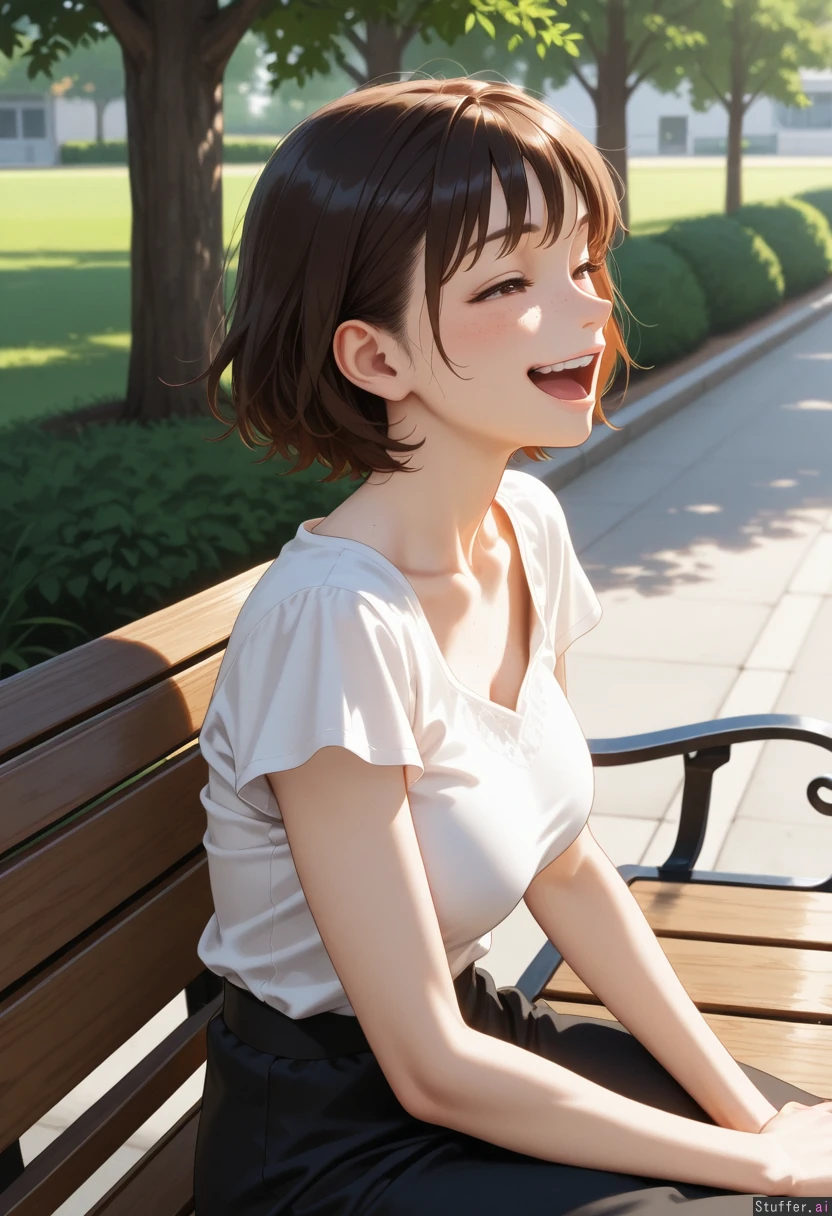 High quality, vivid details, semi realistic, natural light, side view, pov 20 years old, pale skin, beautiful face, brown eyes, brunette, freckles, bangs, short hair, black skirt, white blouse (Smiling, laughing, sitting on park bench) ((Skinny)) ((Large breasts:1.0)) ((Wide hips:1.0))