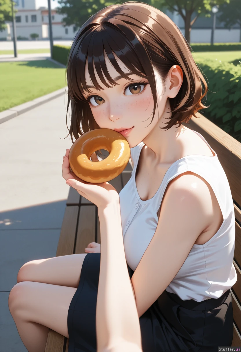 High quality, vivid details, semi realistic, natural light, side view, pov 20 years old, pale skin, beautiful face, brown eyes, brunette, freckles, bangs, short hair, black skirt, white blouse (POV: handing her a donut, sitting on park bench) ((Skinny)) ((Large breasts:1.0)) ((Wide hips:1.0))