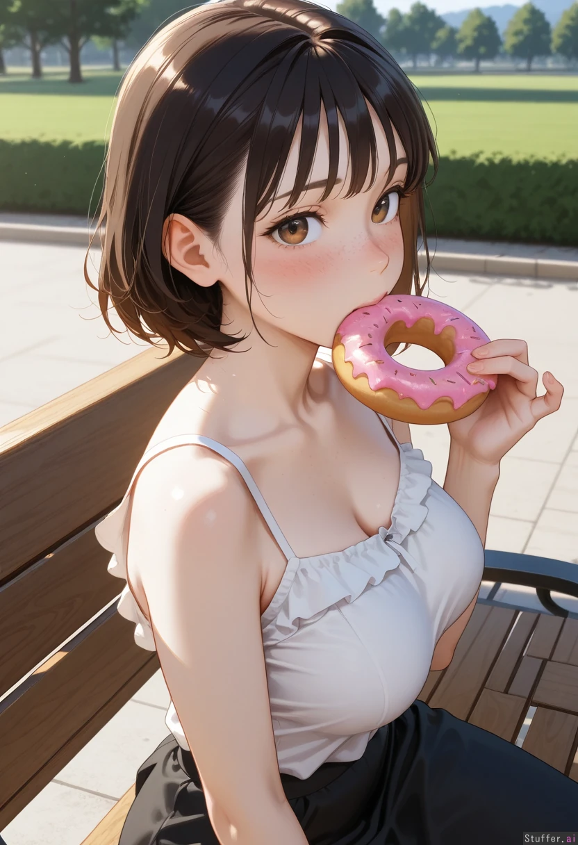 High quality, vivid details, semi realistic, natural light, side view, pov 20 years old, pale skin, beautiful face, brown eyes, brunette, freckles, bangs, short hair, black skirt, white blouse (Eating donut, sitting on park bench, blushing, embarrassed, horny) ((Skinny)) ((Large breasts:1.0)) ((Wide hips:1.0))